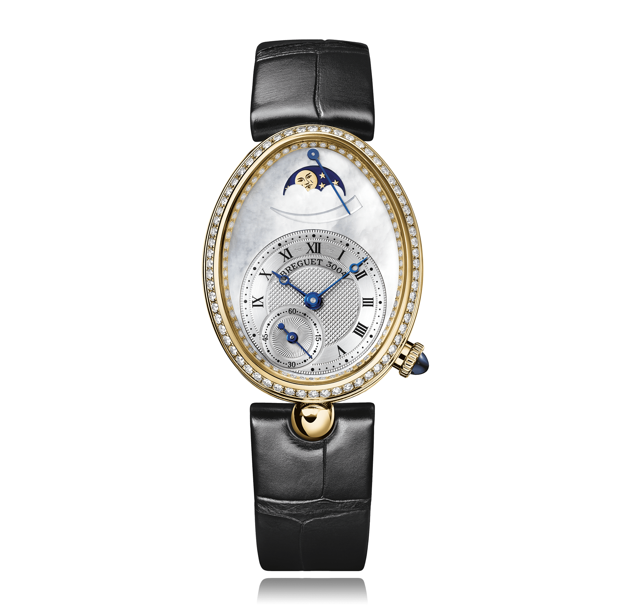 Wristwatch BREGUET Reine De Naples 18K yellow gold, Alligator strap, with folding clasp, mother of pearl dial with romains, automatic sapphire-crystal, with with moon-phase indicator, 128 diamonds, total: 0,83 ct. Ref.:8908BA/52/964D00D