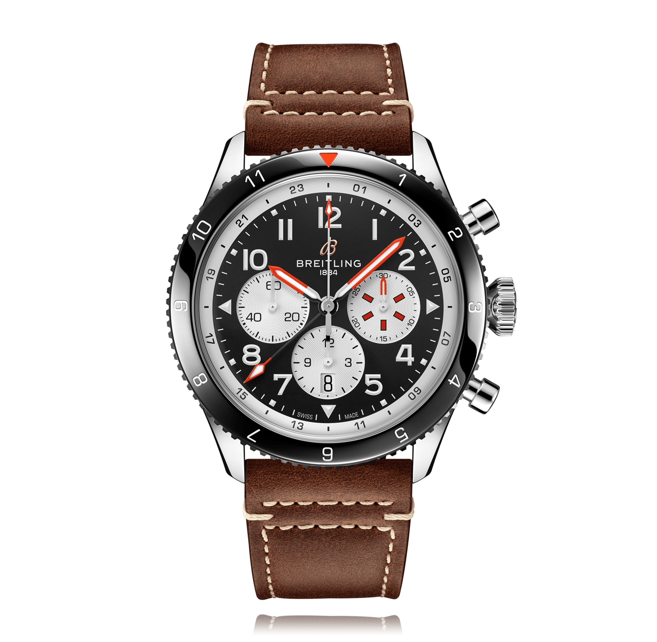 Chronograph, BREITLING Aviator Super Avi B04 GMT46, 46 mm, steel,. bracelet calfskin, with folding clasp, black dial with arabic, automatic, Cal. Breiting B04, sapphire-crystal, 10 atm, Ref.:YB04451A1B1X1