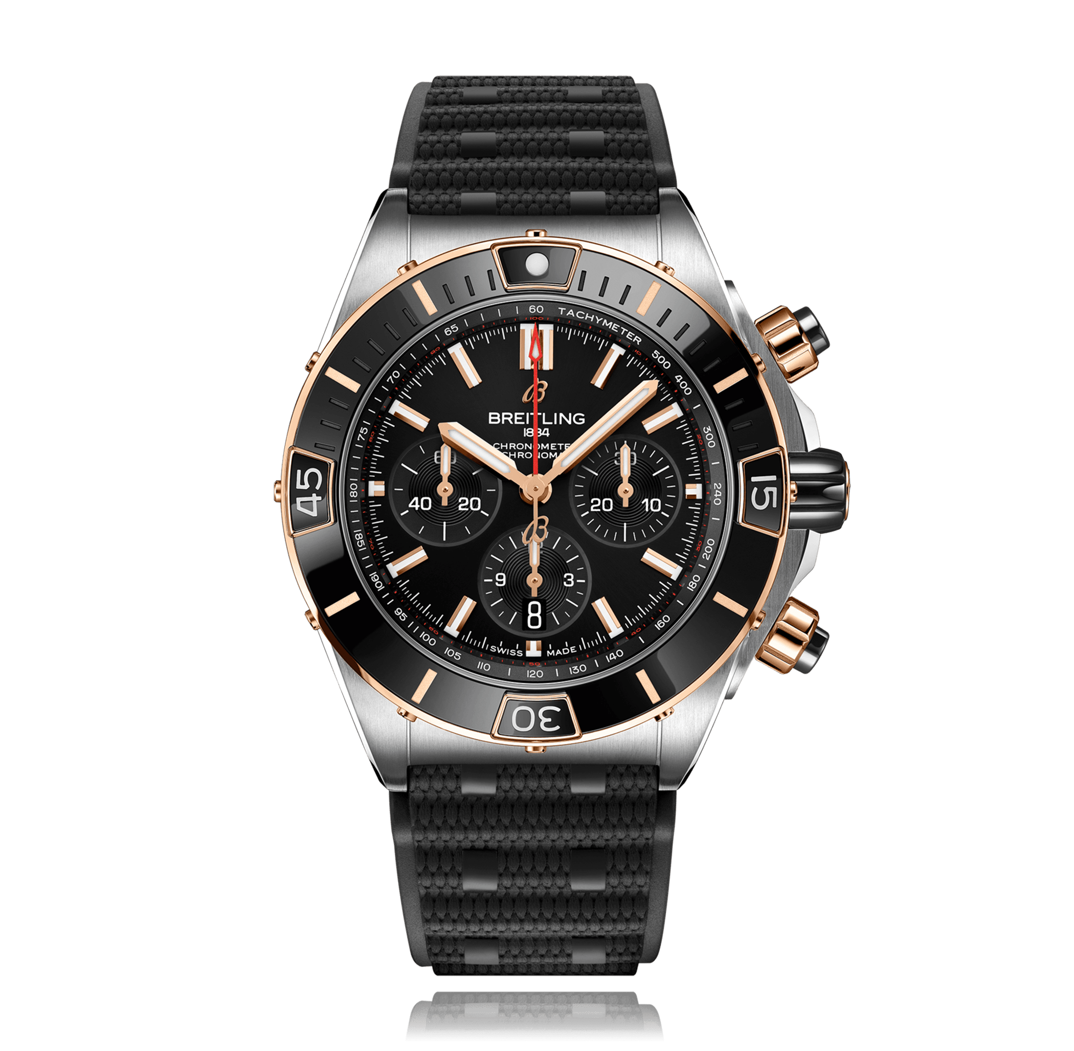 Chronograph, BREITLING Chronomat B01 Chronograph 44, 44 mm, steel/red gold, rubber strap, with folding clasp, black dial with index, automatic, Cal. Breitling 01 (Manufakturkaliber), small second indication, sapphire-crystal, 20 atm, Ref.:UB0136251B1S1