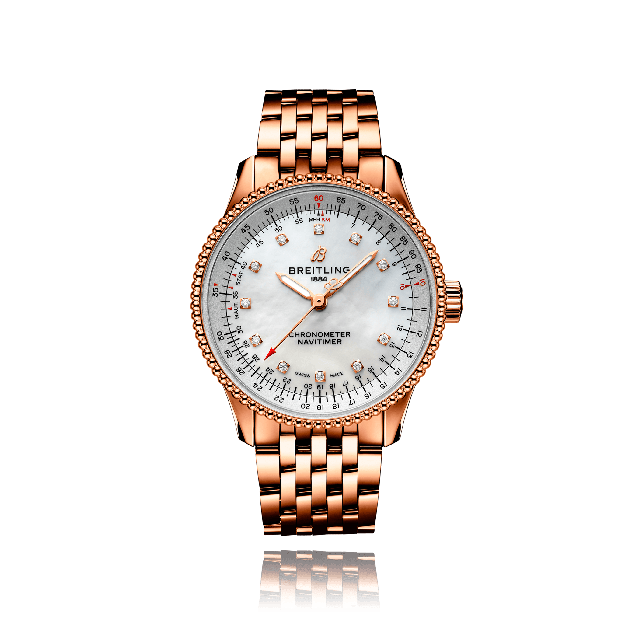 Wristwatch, BREITLING Navitimer Automatic, 35 mm, red gold, Navitimer gold-bracelet, with folding clasp, mother of pearl dial with 12 diamonds, automatic, Cal. Breitling 17, centre seconds, sapphire-crystal, 3 atm, 12 brilliants, total: 0.07 ct. Ref.:R17395211A1R1