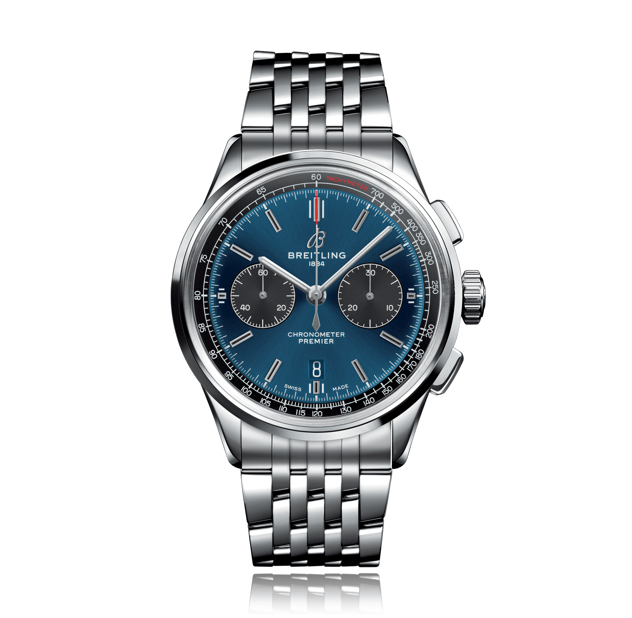 Chronograph BREITLING Premier B01 Chronograph 42, 42mm, steel, Navitimer steel bracelet, blue dial with index, automatic Cal. Breitling B01, sapphire-crystal, 10 atm, Ref.:AB0118A61C1A1