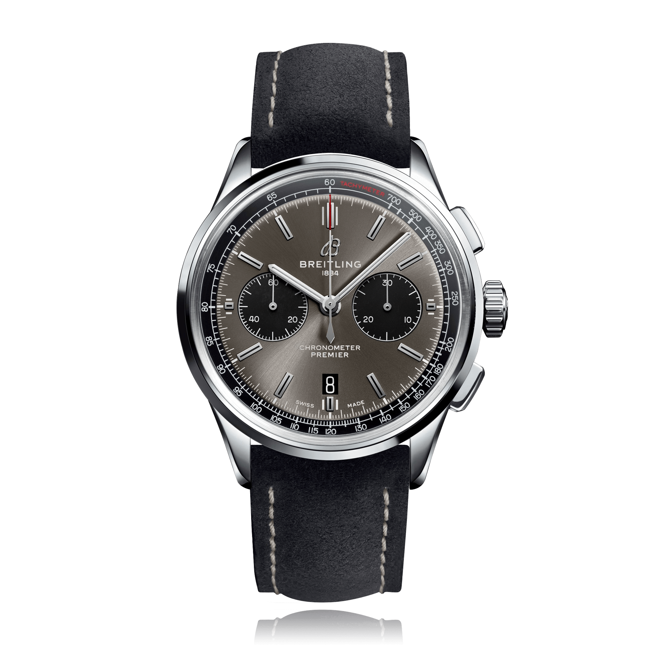 Chronograph BREITLING Premier B01 Chronograph 42, 42mm, steel, leather strap, with folding clasp, anthracite dial with index, automatic Cal. Breitling B01, sapphire-crystal, 10 atm, Ref.:AB0118221B1X1