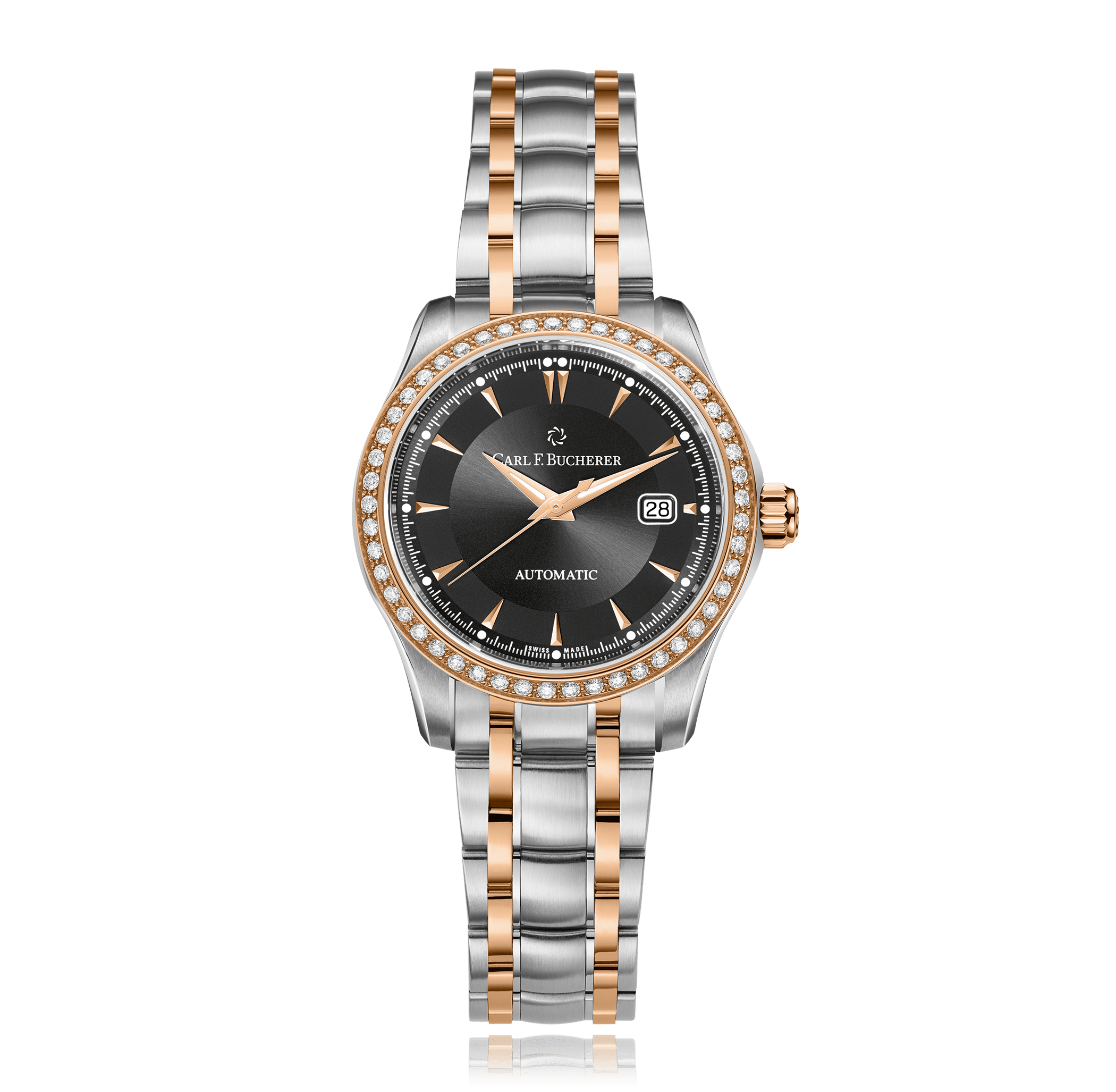 CARL F. BUCHERER Manero AutoDate 30 mm wristwatch, steel/red gold automatic with date round 3 atm dial: black index, bracelet steel/rose gold, 49 diamonds brilliant cut total 0.5 ct TW VVS Ref.:00.10911.07.33.31