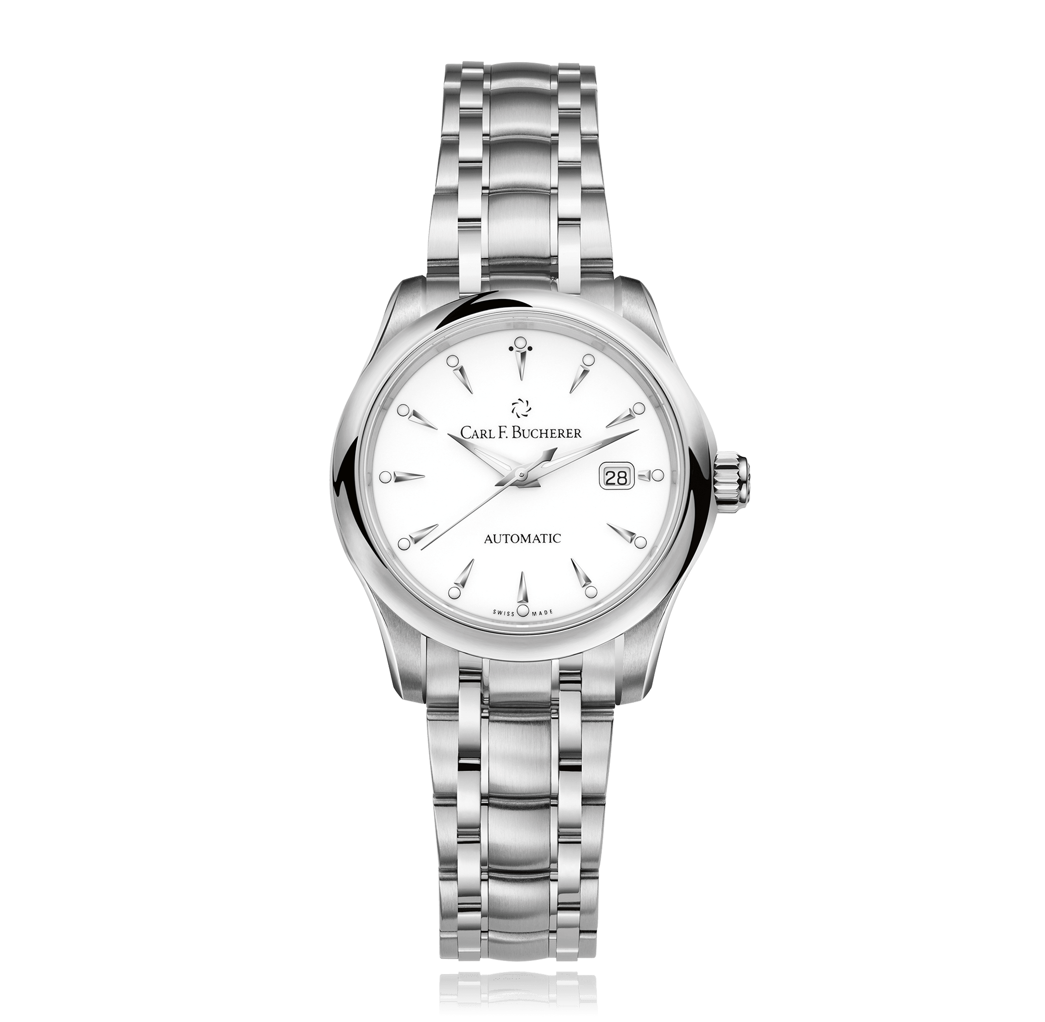 CARL F. BUCHERER Manero AutoDate 30 mm wristwatch, steel automatic with date round 3 atm dial: white index, steel bracelet, Ref.:00.10911.08.23.21