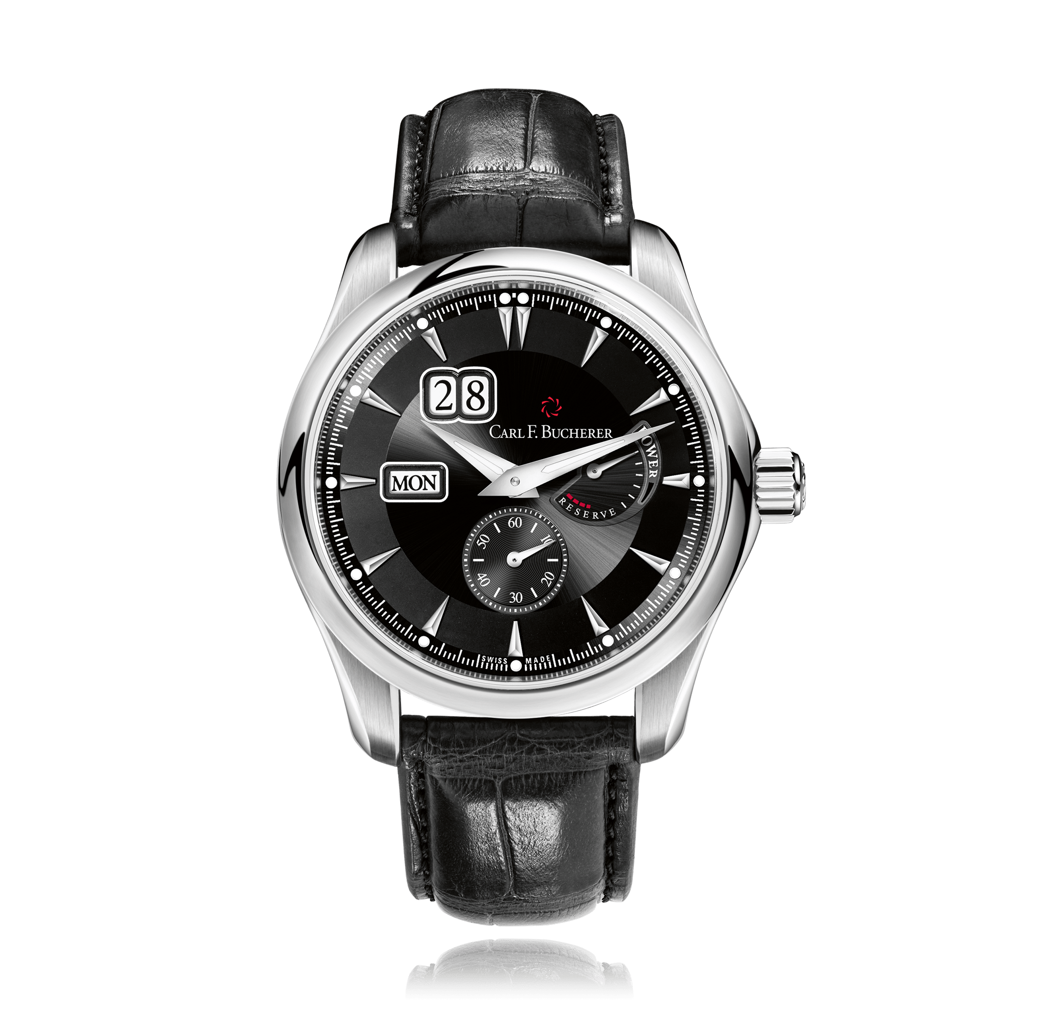 CARL F. BUCHERER Manero PowerReserve 42.5 mm wristwatch, steel automatic Power-reserve with date and day round 3 atm dial: black index, Alligator strap with folding clasp, Ref.:00.10912.08.33.01