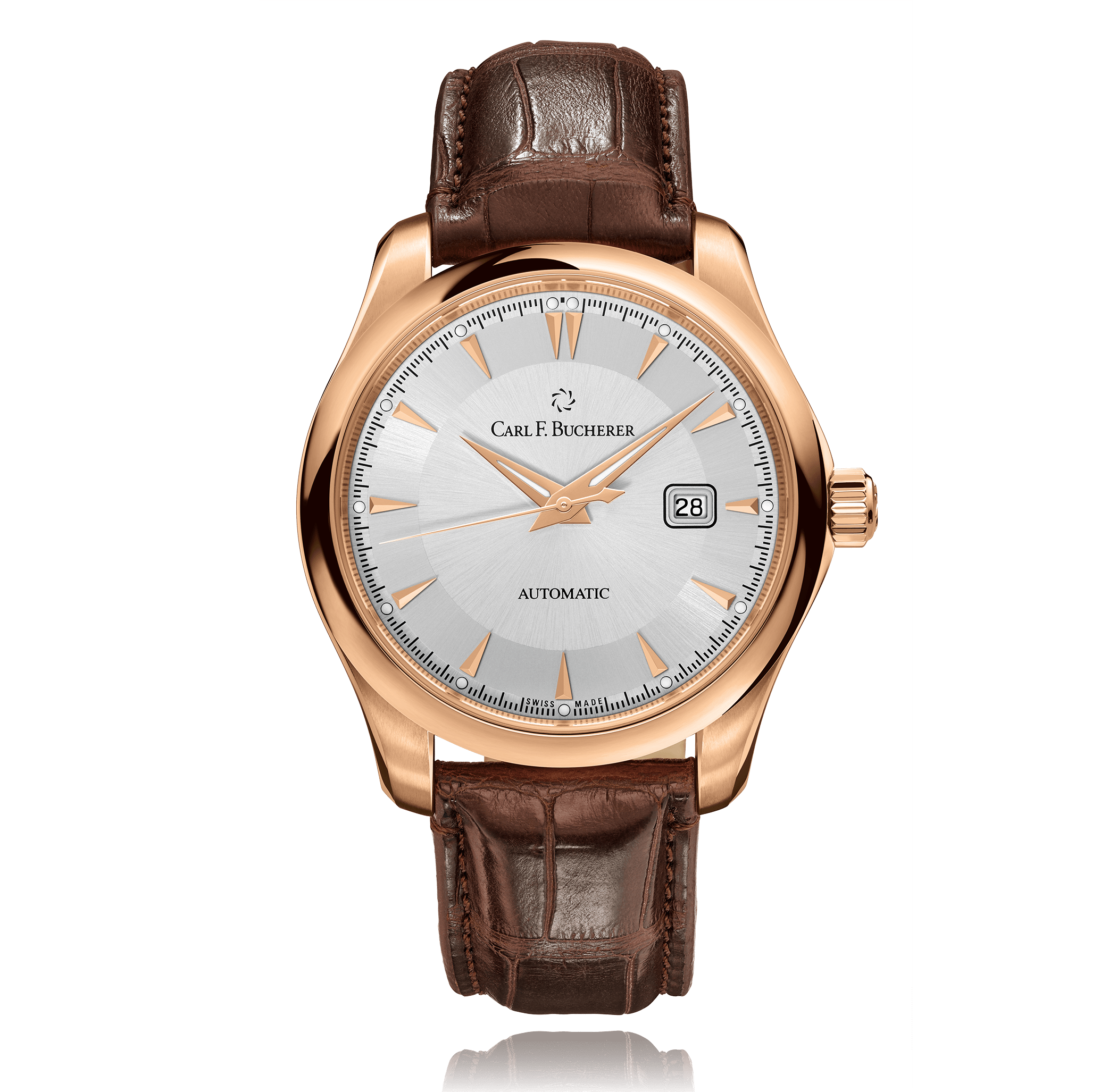 CARL F. BUCHERER Manero AutoDate 42.5 mm wristwatch, 18 K red gold automatic with date round 3 atm dial: silver index, Alligator strap, Ref.:00.10915.03.13.01