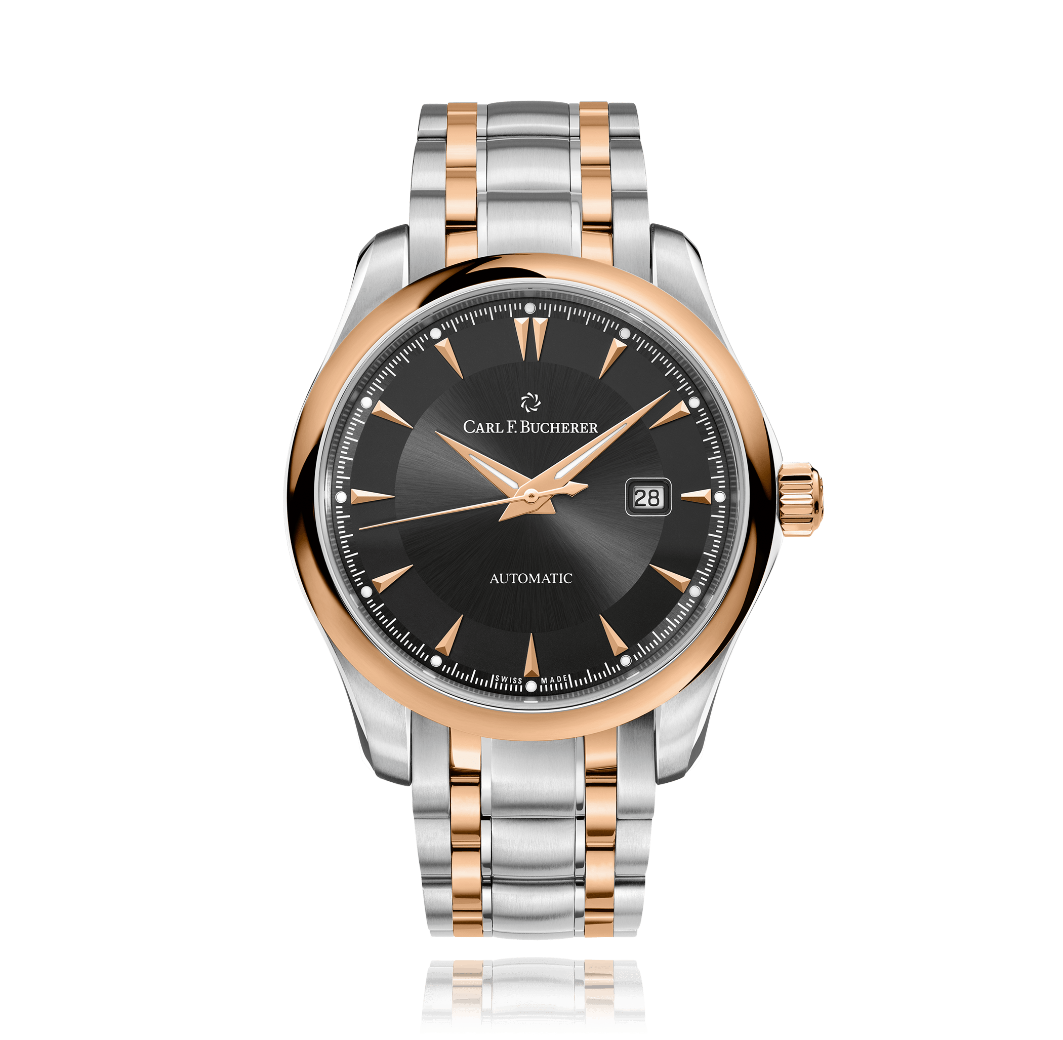 CARL F. BUCHERER Manero AutoDate 42.5 mm wristwatch, steel/red gold automatic with date round 3 atm dial: black index, steel/gold bracelet, Ref.:00.10915.07.33.21