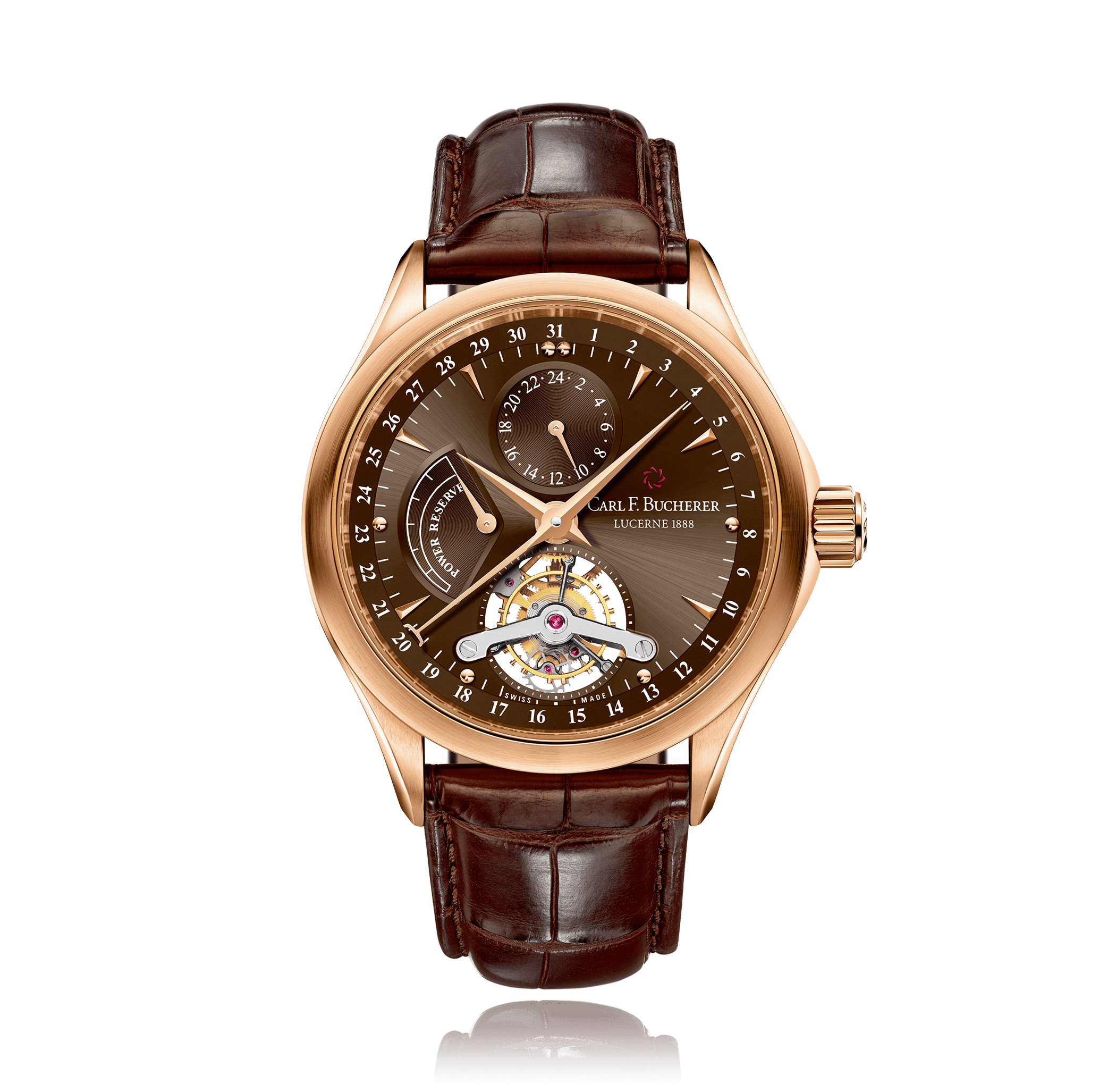 CARL F. BUCHERER Manero Tourbillon 41.8 mm wristwatch, 18 K red gold manual winding 24 h display Tourbillon Power-reserve with date round 3 atm dial: brown index, alligator leather strap with folding clasp, Limited Edition 188 pcs Ref.:00.10918.03.93.01