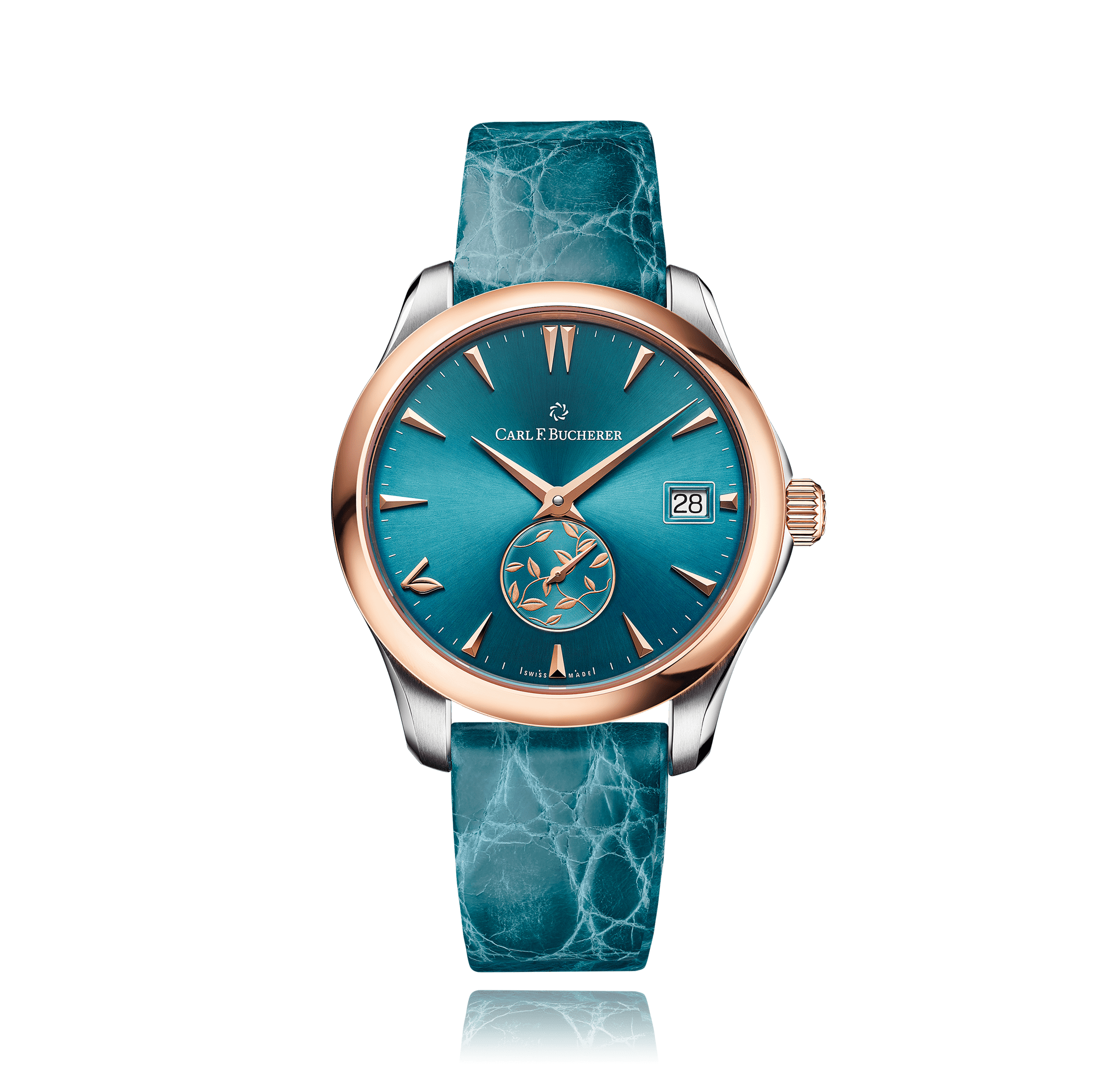 CARL F. BUCHERER Manero AutoDate 35.5 mm wristwatch, steel/red gold automatic with date round 3 atm dial: ice blue index, crocodile leather with folding clasp, (Special Edition LOVE) Ref.:00.10922.07.53.01