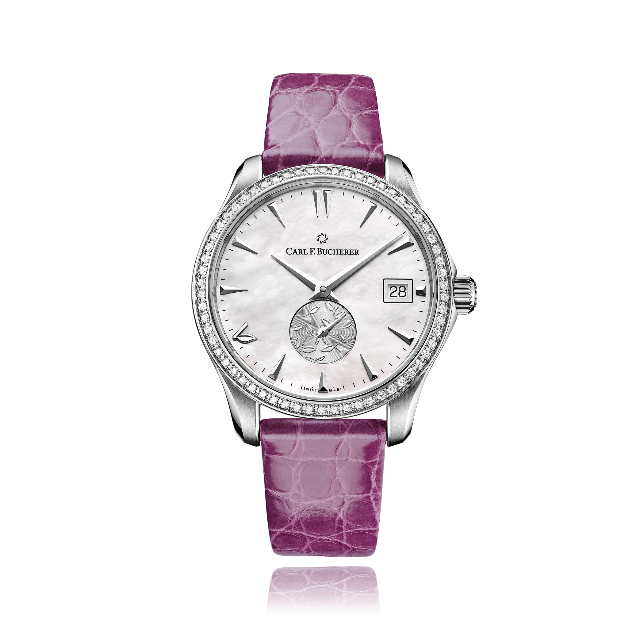 CARL F. BUCHERER Manero AutoDate 35.5 mm wristwatch, steel automatic with date round 3 atm dial: mother of pearl index, alligator leather with folding clasp, 62 diamonds brilliant cut total 0.65 ct TW-F VVS1 (Special Edition LOVE) Ref.:00.10922.08.73.11
