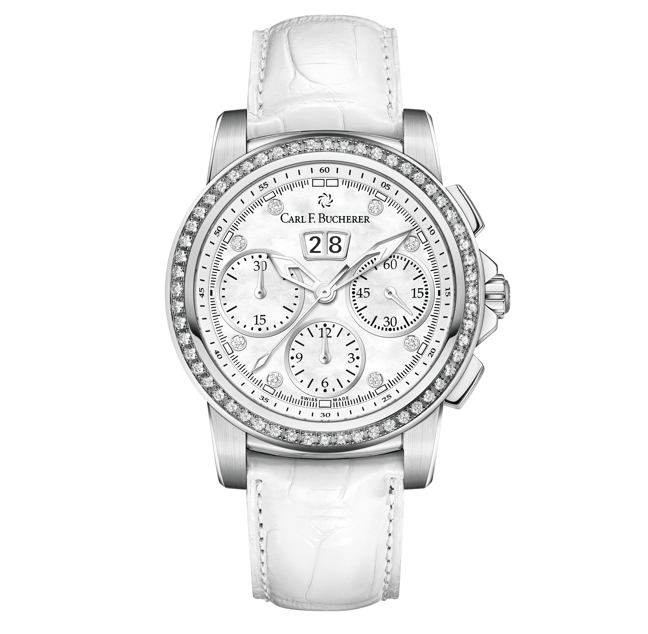 CARL F. BUCHERER Patravi ChronoDate 40 mm chronograph, steel automatic big date round 5 atm/screw-down crown dial: mother of pearl 8 diamonds, Alligator strap with folding clasp, 56 diamonds brilliant cut total 1 ct TW-F VVS incl. add. calf leather strap Ref.:00.10611.08.74.13