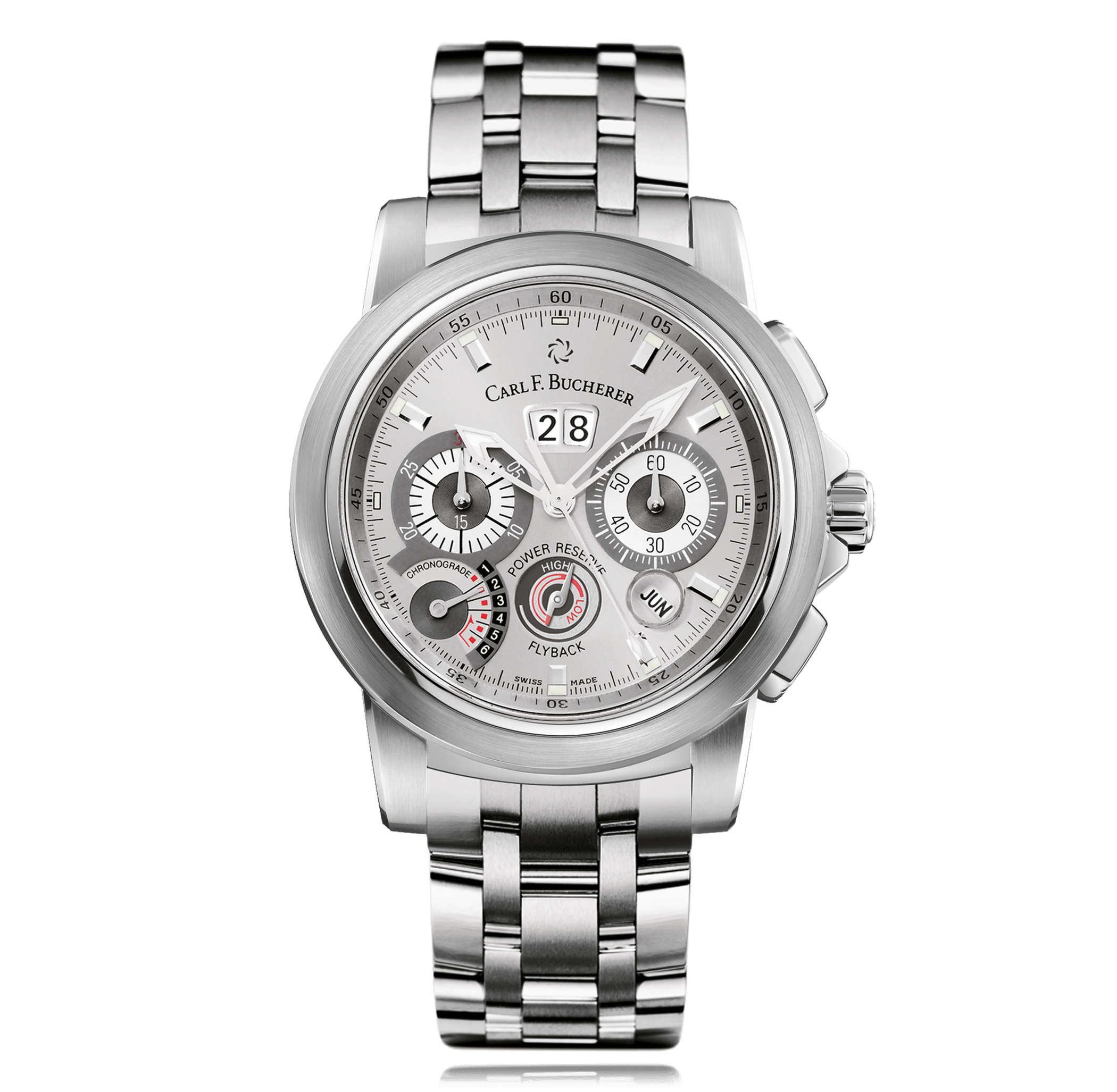 CARL F. BUCHERER Patravi Chronograde 44.6 mm chronograph, steel automatic Fly Back annual calendar Power-reserve big date 5 atm/screw-down crown dial: rhodié index, steel bracelet, Ref.:00.10623.08.63.21