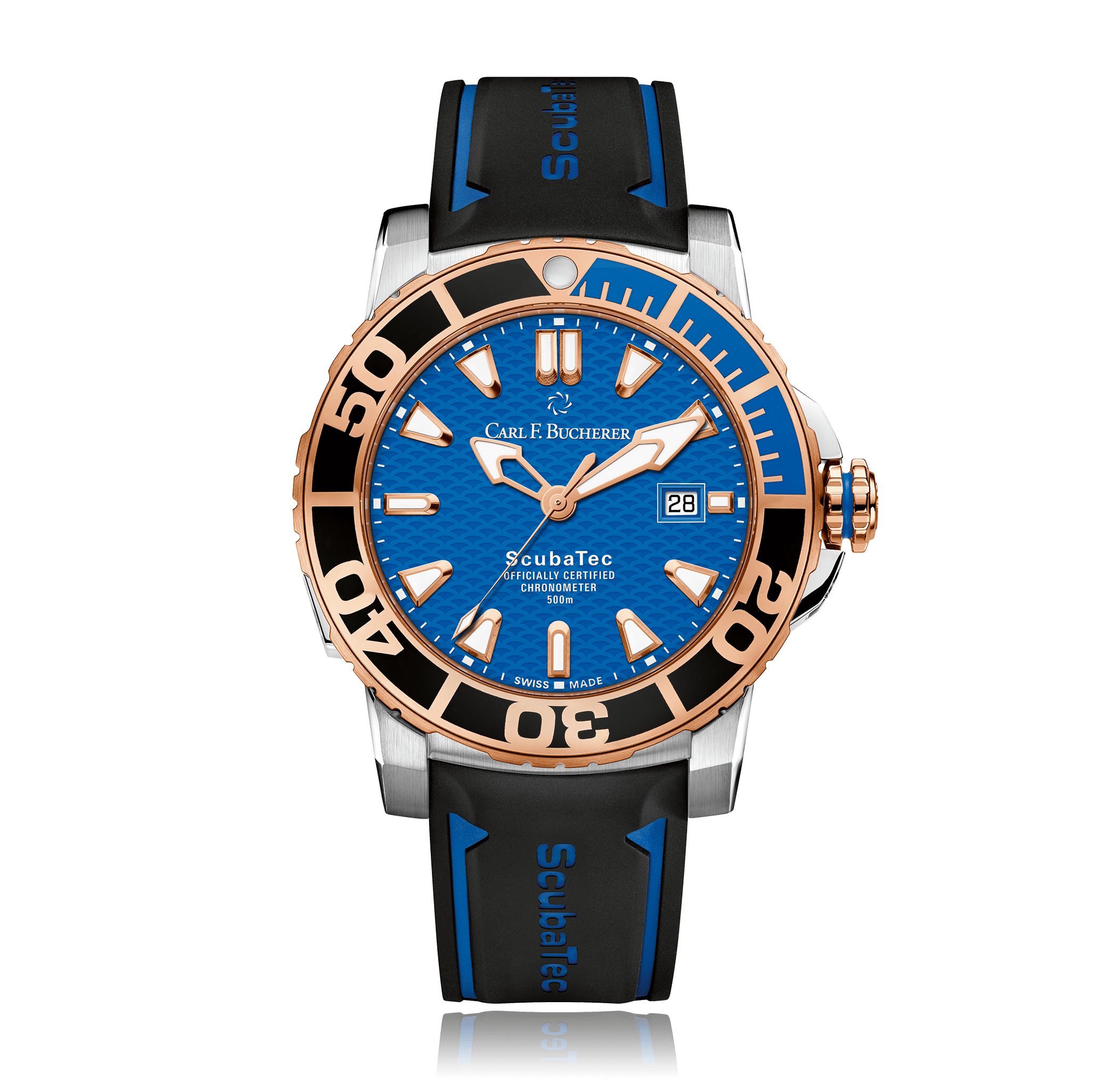 CARL F. BUCHERER Patravi ScubaTec 44.6 mm wristwatch, Steel/red gold/ceramic automatic with date round 50 Atm/screw-down crown dial: blue index, rubber strap with folding clasp, Ref.:00.10632.24.53.01