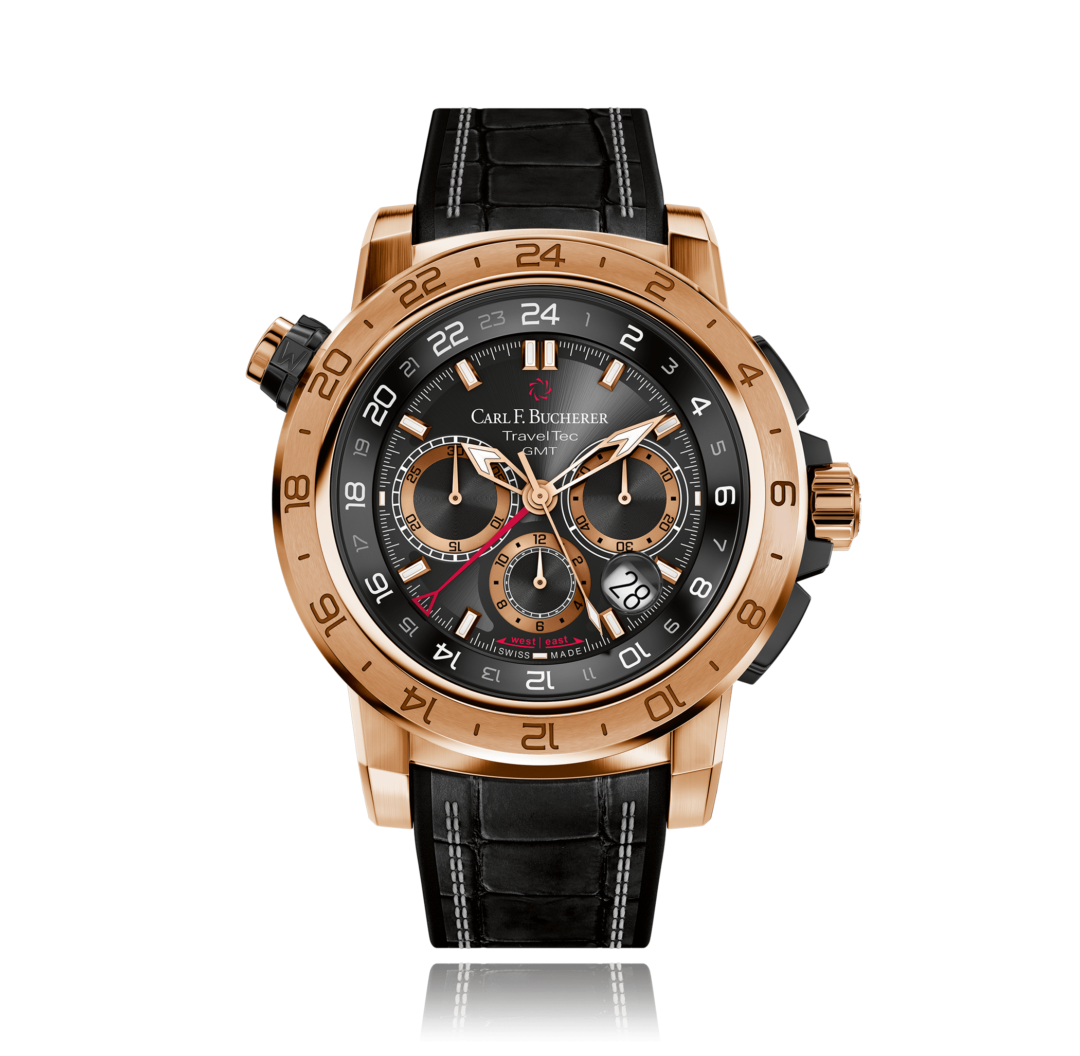 CARL F. BUCHERER Patravi TravelTec II GMT 47.4 mm chronograph, 18 K red gold automatic with date round 10 atm/screw-down crown dial: black index, rubber/Alligator strap with folding clasp, Ref.:00.10633.03.33.01