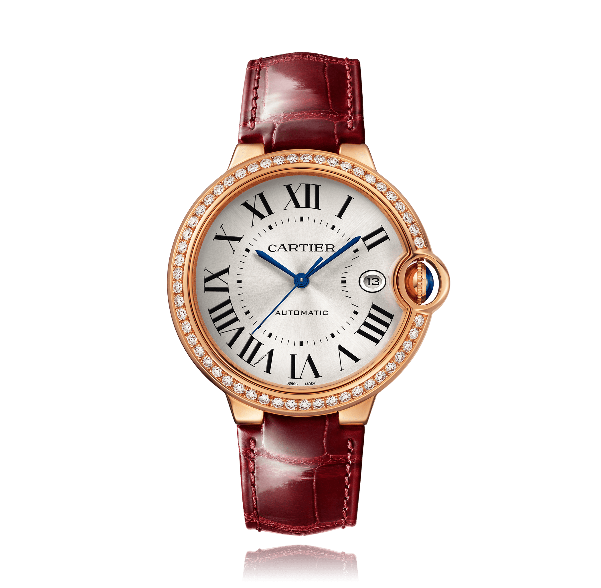 Wristwatch, CARTIER Ballon Bleu de Cartier, 40 mm, large, 18K red gold, alligator leather strap, with pin buckle, silver dial with romains, automatic, Cal. 1847 MC, centre seconds,, sapphire-crystal, 3 atm, diamonds, total: 1.06 ct. Dia.- Lünette ef.:WJBB0056