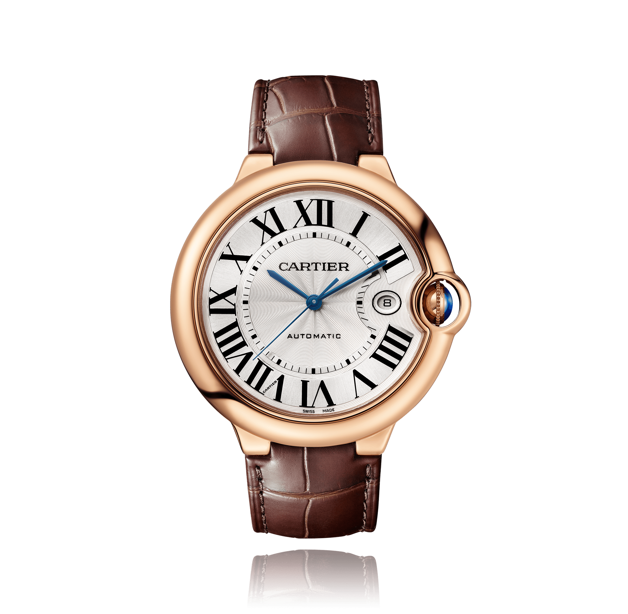 Wristwatch, CARTIER Ballon Bleu de Cartier, 42 mm, large, 18K red gold,. bracelet crocodile leather, with folding clasp, silver dial with romains, automatic, centre seconds, sapphire-crystal, 3 atm, Ref.:WGBB0030