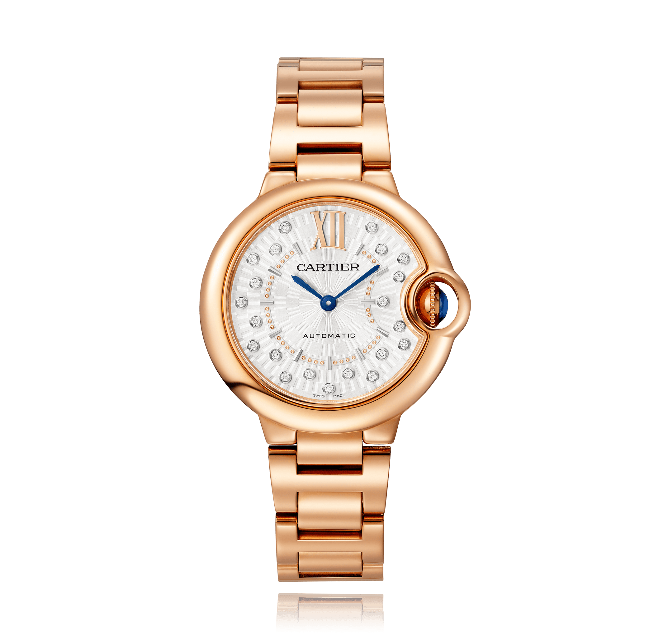 Wristwatch, CARTIER Ballon Bleu de Cartier, 33 mm, 18K red gold,. gold-bracelet, with folding clasp, silver dial with röm./Index, automatic, sapphire-crystal, 21 total: 0.12 ct. Diamanten auf Zifferblatt Ref.:WGBB0054