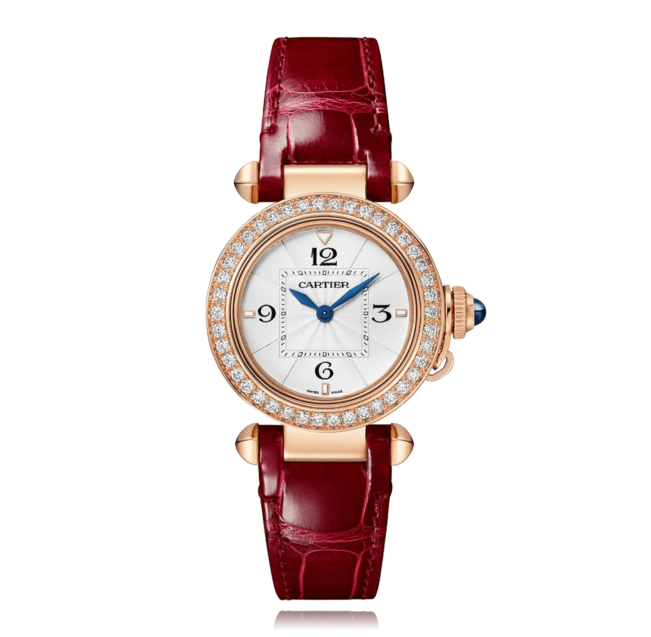 Wristwatch, CARTIER Pasha de Cartier, 30 mm, 18K red gold, alligator leather strap, silver dial with arab./Index, quartz,, sapphire-crystal, 3 atm, diamonds, total: 0.86 ct. Dia.- Lünette ef.:WJPA0017