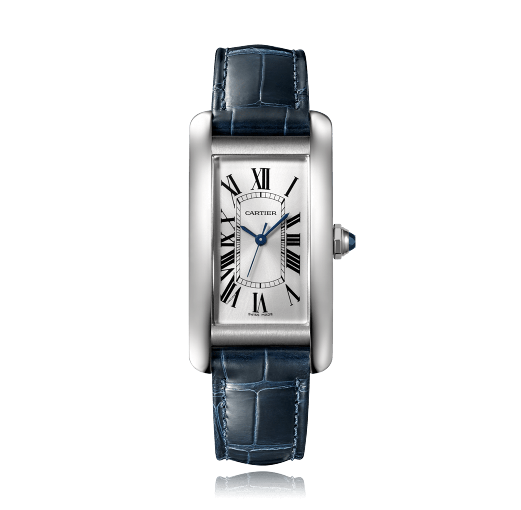 Wristwatch, CARTIER Tank Américaine, medium, steel,. alligator leather strap, with folding clasp, silver dial with romains, automatic, Cal. 077, centre seconds, sapphire-crystal, Gehäuseabmessungen: 41,6 mm x 22,6 mm Ref.:WSTA0017