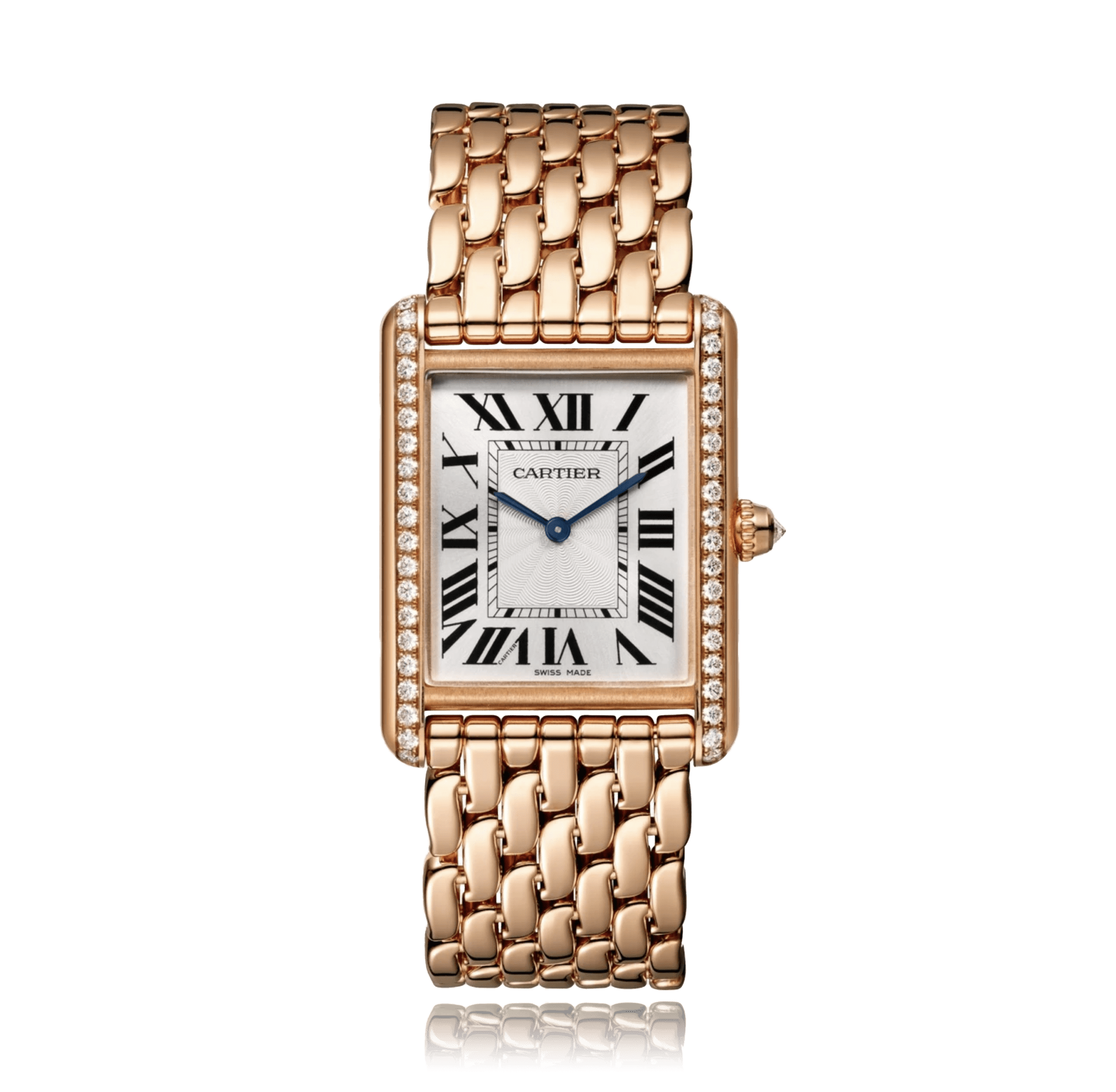 Wristwatch, CARTIER Tank Louis Cartier, 33.7 mm, 18K red gold, gold-bracelet, silver dial with romains, manual winding, Cal. 8971 MC,, sapphire-crystal, 3 atm, 41 diamonds, total: 0.65 ct. Gehäuse mit Diamanten ef.:WJTA0021