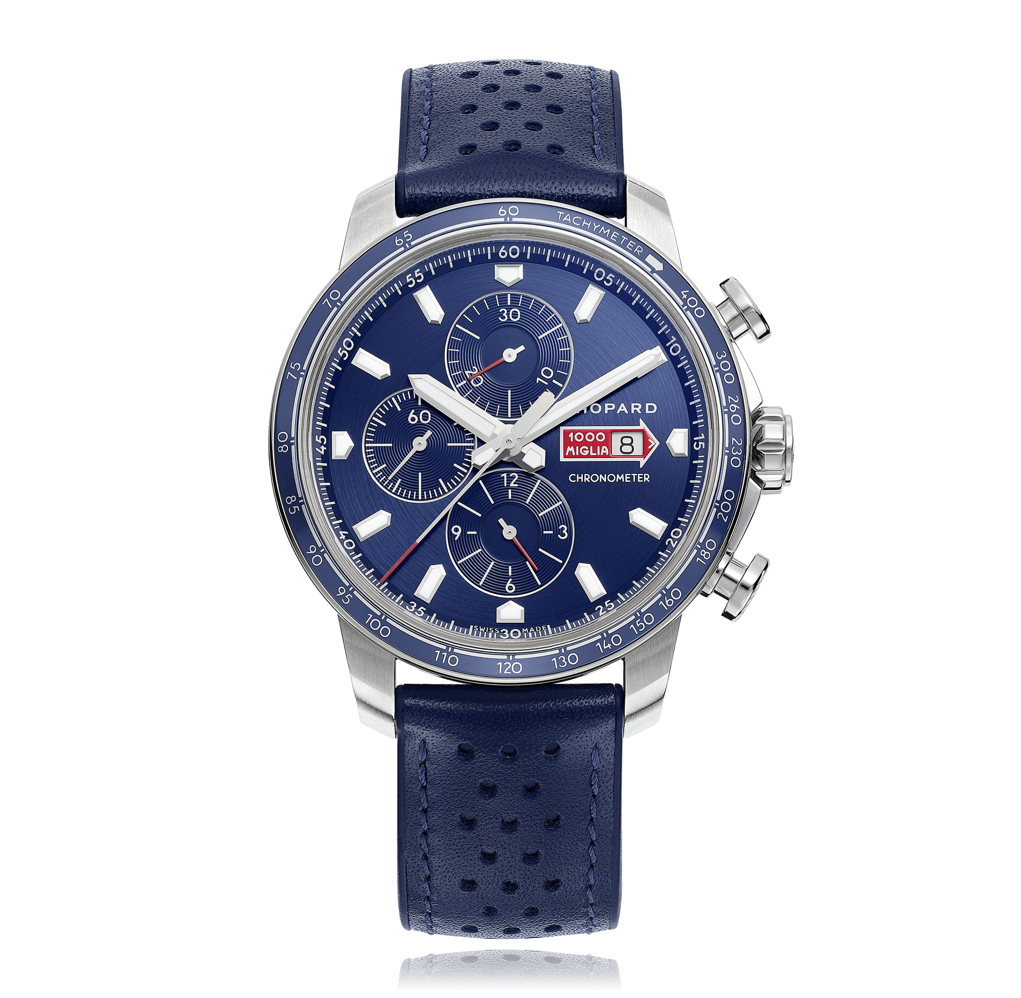 Chronograph CHOPARD Classic Racing Mille Miglia, 44 mm, steel, leather/rubber strap, with folding clasp, blue dial with arab./Index, automatic sapphire-crystal, 10 atm, Ref.:168571-3007