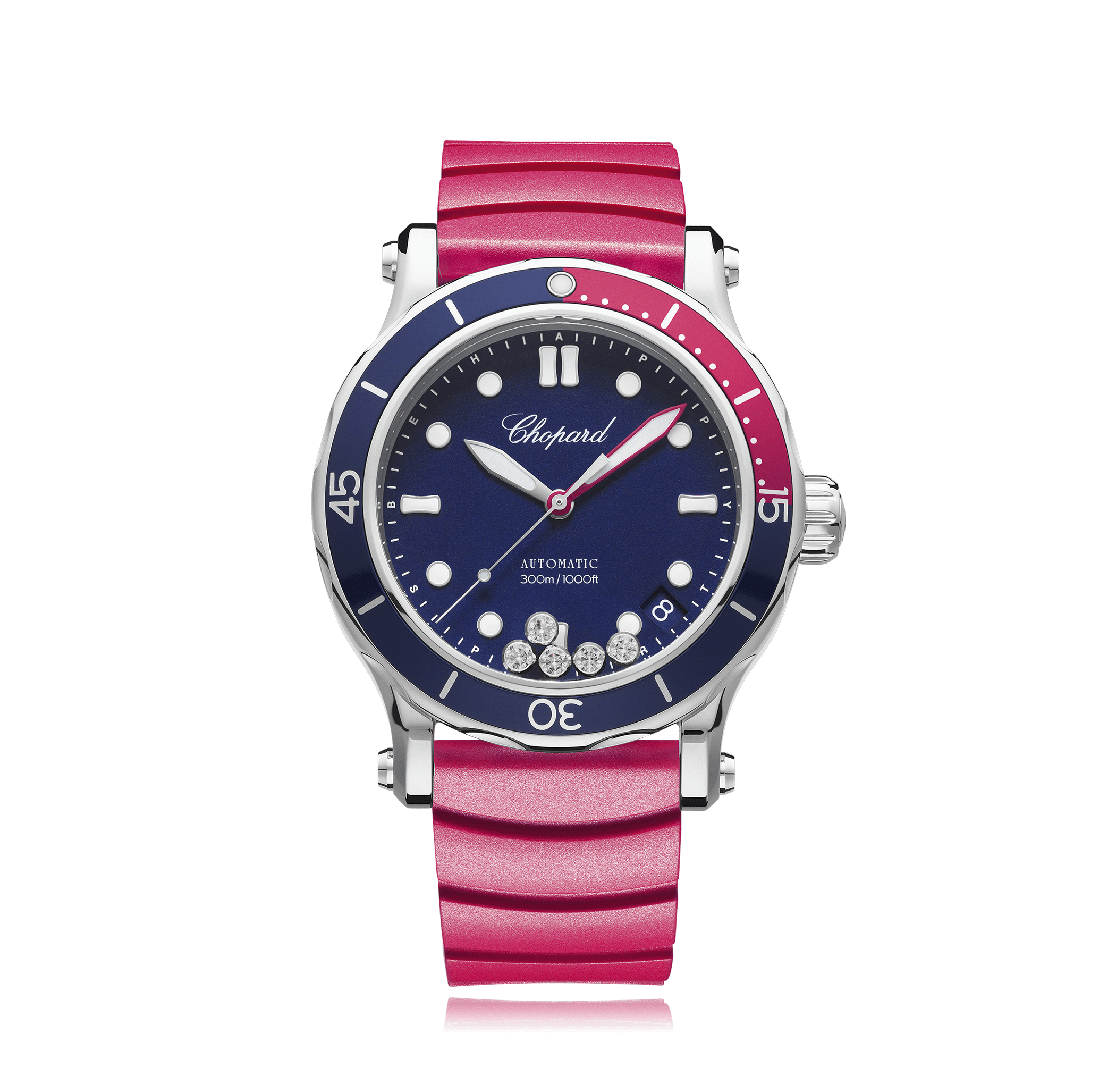 Wristwatch CHOPARD Happy Sport 40mm, XL, steel, rubber strap, blue dial with index, automatic Cal. 01.01-C, sapphire-crystal, 30 atm, 5 diamonds, total: 0.24 ct. Ref.:278587-3002