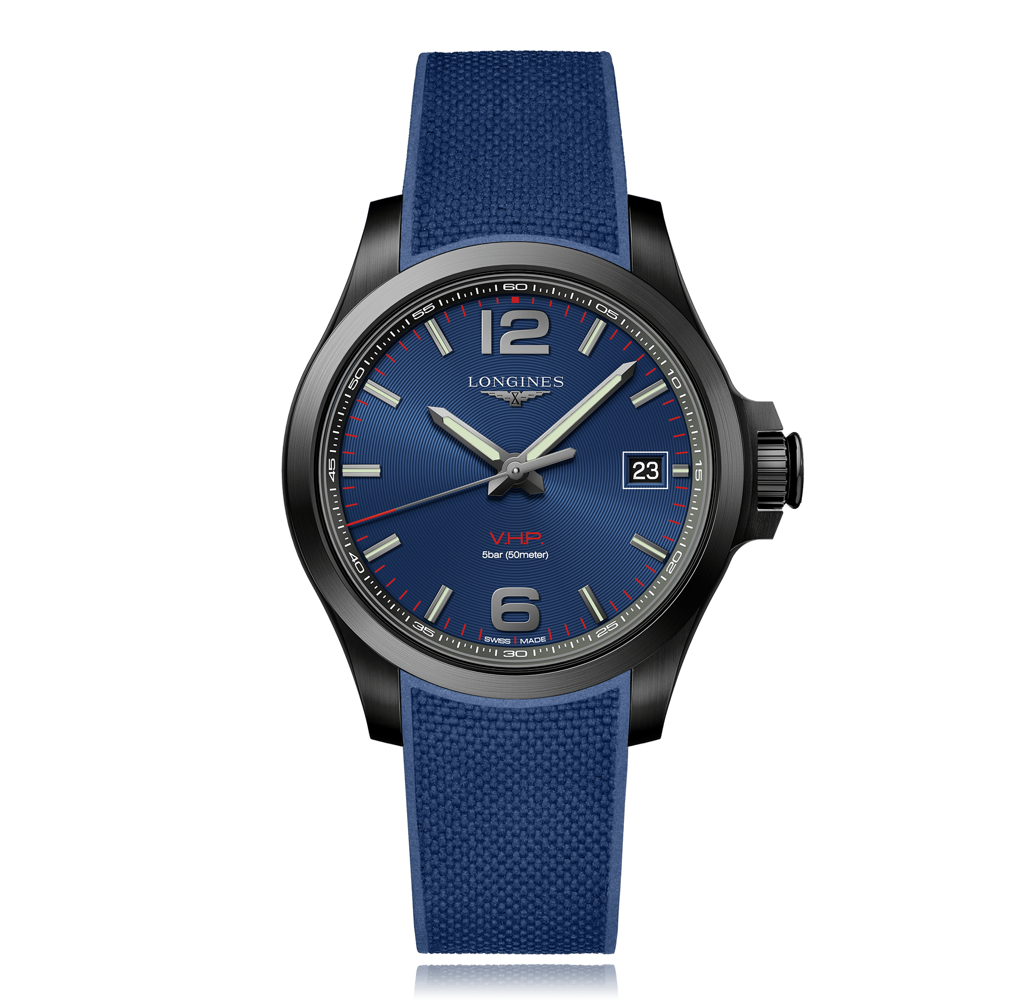 Wristwatch LONGINES Conquest 41mm, PVD, rubber strap, with folding clasp, blue dial with arab./Index, quartz Cal. 288, sapphire-crystal, 5 atm, with end of life indicator, Ref.:L3.716.2.96.9