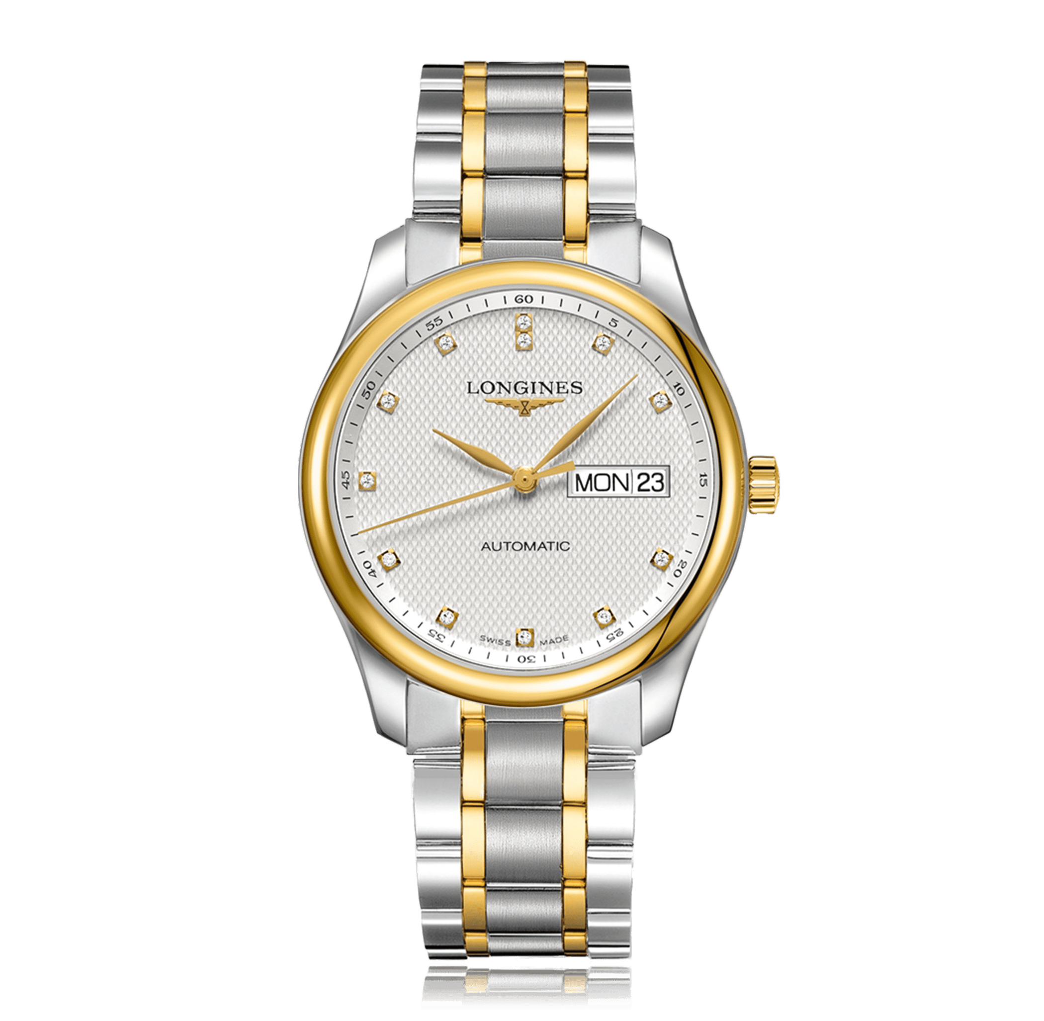 Wristwatch LONGINES The Longines Master Collection 38.5mm, steel/yellow gold, steel/gold bracelet, silver dial with 12 diamonds, automatic Cal. 2892/A2, sapphire-crystal, 3 atm, 12 diamonds, total: 0.05 ct. Ref.:L2.755.5.77.7