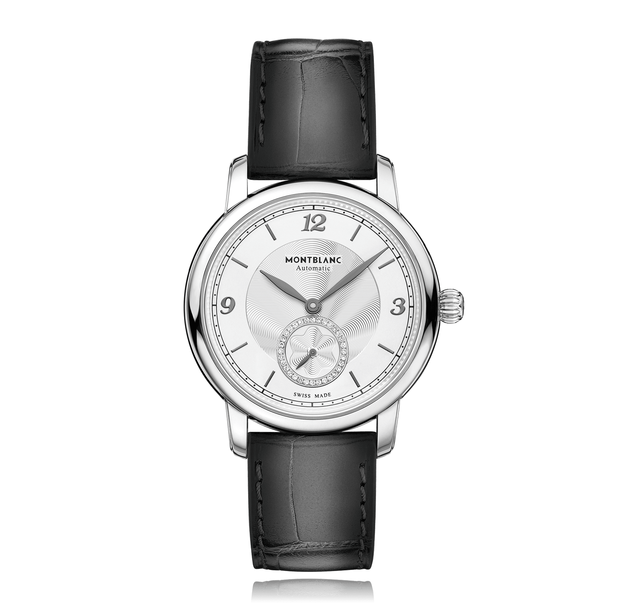 Wristwatch MONTBLANC Star 36mm, steel, leather strap, with pin buckle, silver dial with arab./Index, automatic Cal. MB M24.16, sapphire-crystal, 3 atm, 32 diamonds, total: 0.1 ct. Ref.:118510