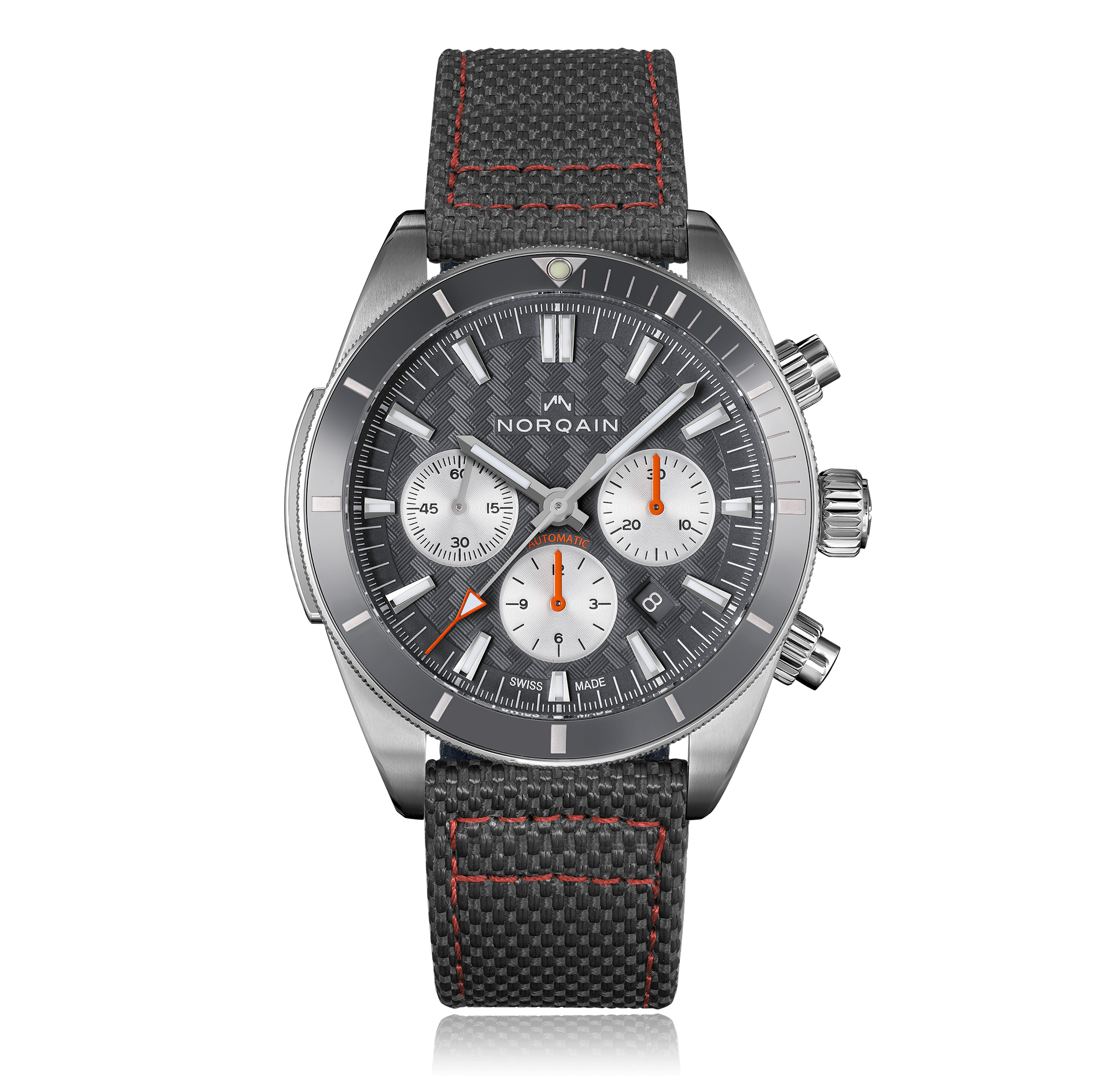 Chronograph Norqain Adventure 44mm, steel/ceramic, textile ribbon, rhodium-plated/grey dial with index, automatic Cal. ETA 7753, sapphire-crystal, 10 atm/screw-down crown, Ref.:N1200C23C/G121/10OC.20S