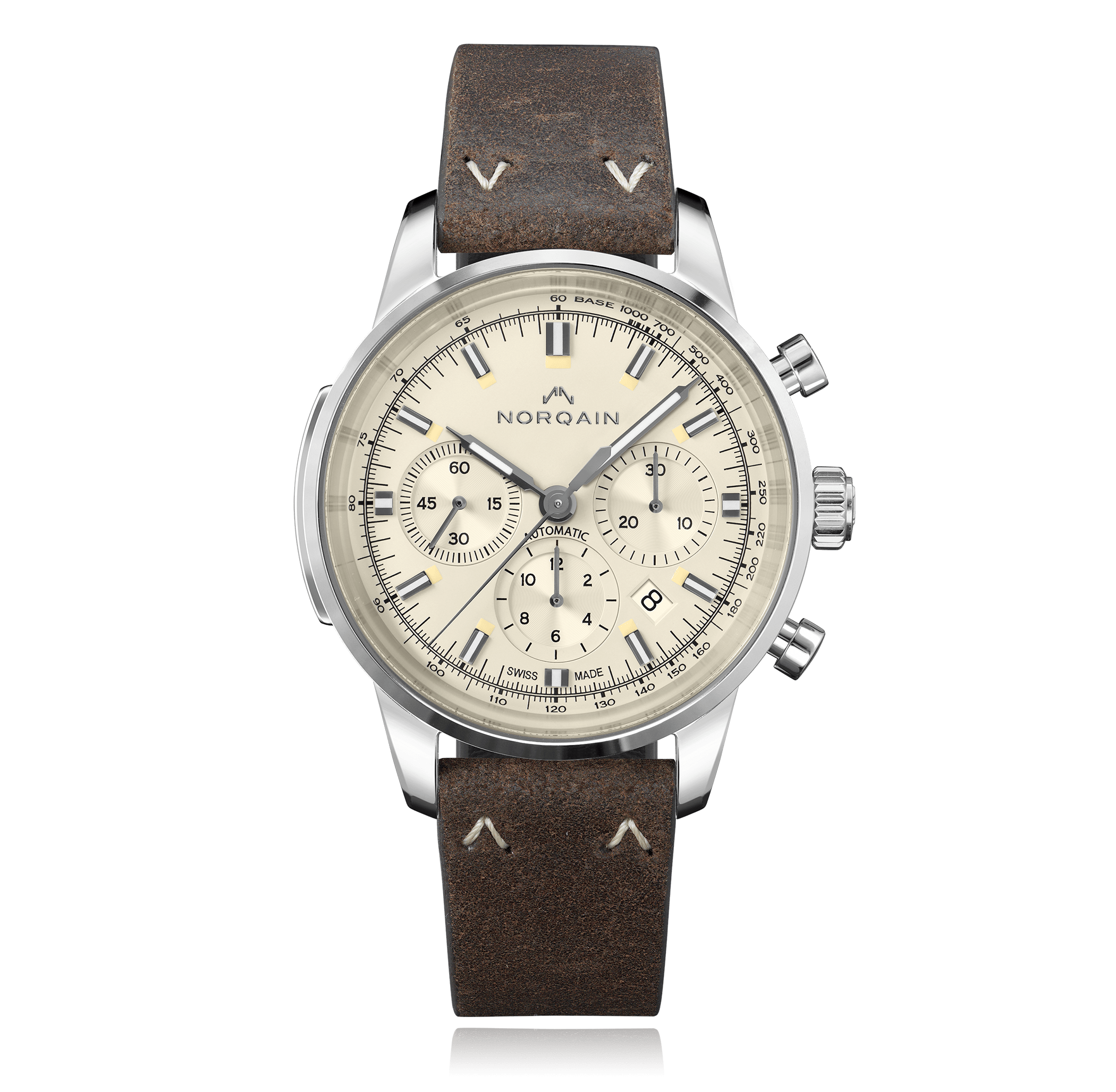 Chronograph Norqain Freedom 43mm, steel, leather strap, creamy dial with index, automatic Cal. ETA 7753, sapphire-crystal, 10 atm/screw-down crown, Ref.:N2200S22C/C221/20PO.18S