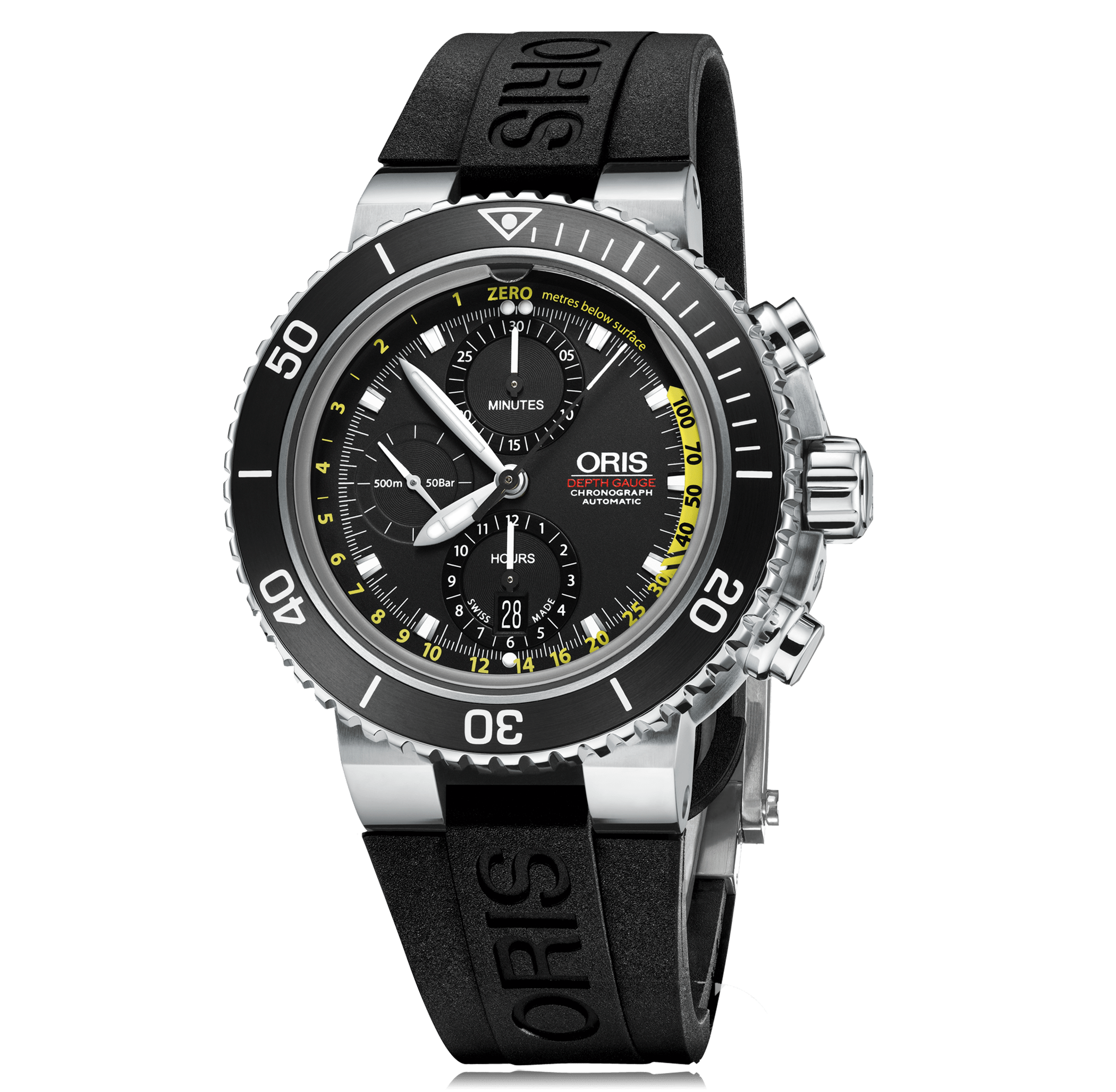 Chronograph ORIS Aquis Depth Gauge, 48mm, steel, rubber strap, with folding clasp, black dial with index, automatic Cal. SW 500, sapphire-crystal, 50 Atm/screw-down crown, Ref.:774.7708.4154-4.26.34EB