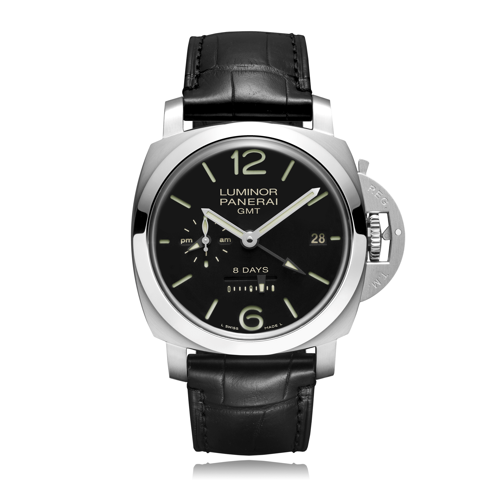 Wristwatch PANERAI Luminor 44mm, steel, leather strap, black dial with arabic, manual winding Cal. P2002, sapphire-crystal, 10 atm, with GMT, Ref.:PAM00233