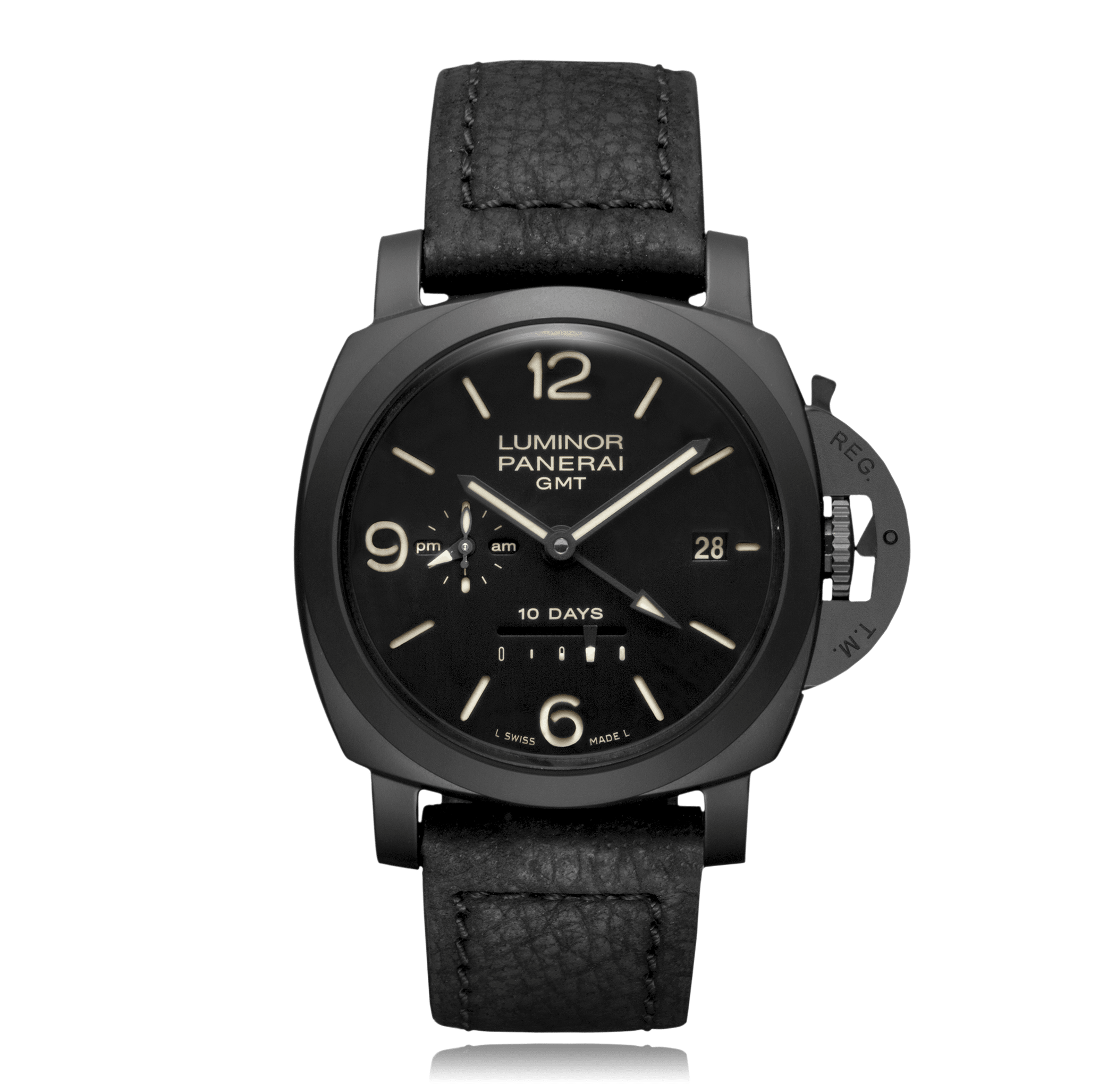 Wristwatch PANERAI Luminor 44mm, ceramic, leather strap, with pin buckle, black dial with arab./Index, automatic Cal. Panerai P.2003, sapphire-crystal, 10 atm, with GMT, Ref.:PAM00335