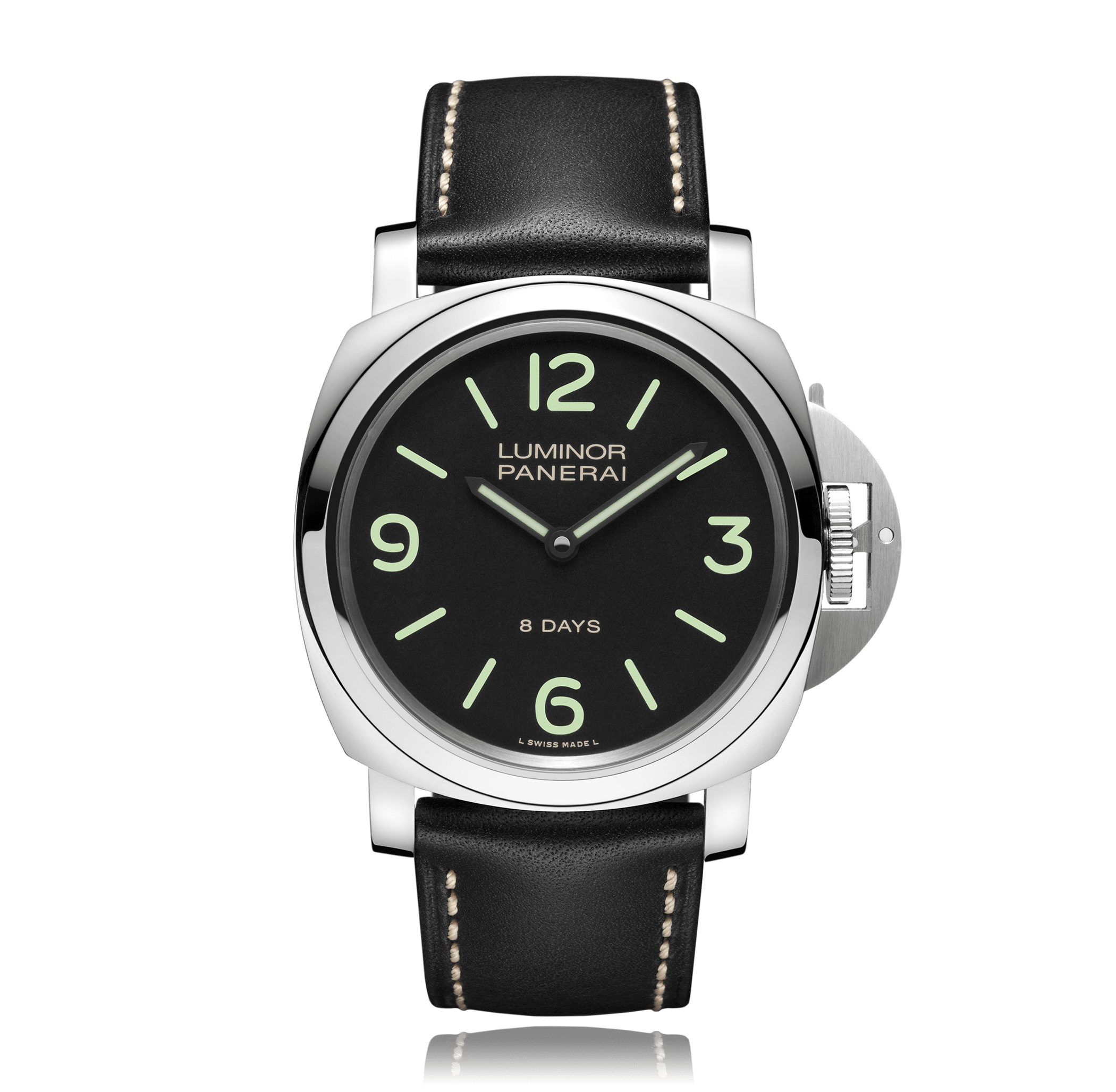 Wristwatch PANERAI Luminor 44mm, steel, leather strap, black dial with arab./Index, manual winding Cal. P.5000, sapphire-crystal, Ref.:PAM00560