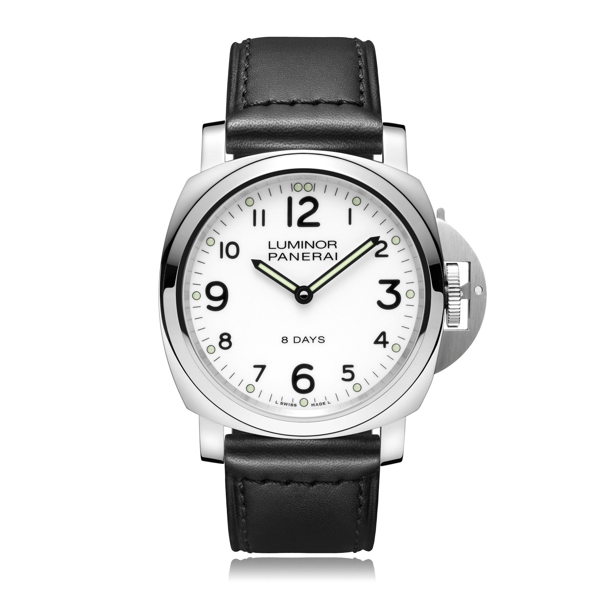 Wristwatch PANERAI Luminor 44mm, steel, leather strap, white dial with arab./Index, manual winding Cal. P.5000, sapphire-crystal, Ref.:PAM00561