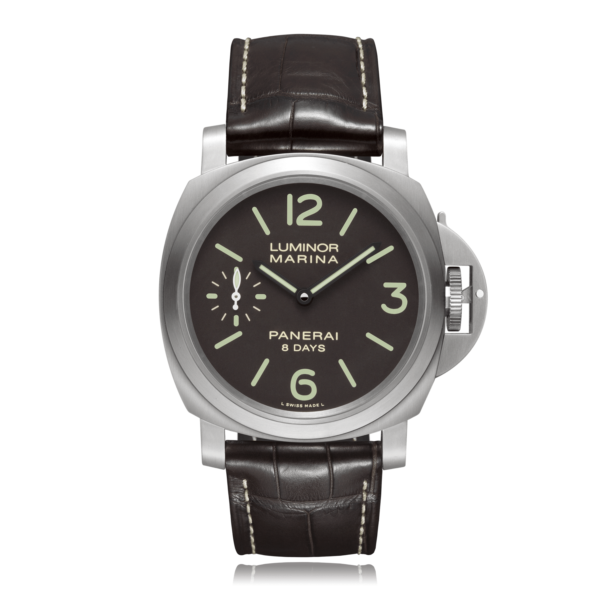 Wristwatch PANERAI Luminor 44mm, titanium, Alligator strap, with pin buckle, brown dial with arab./Index, manual winding Cal. P.5000, sapphire-crystal, Ref.:PAM00564