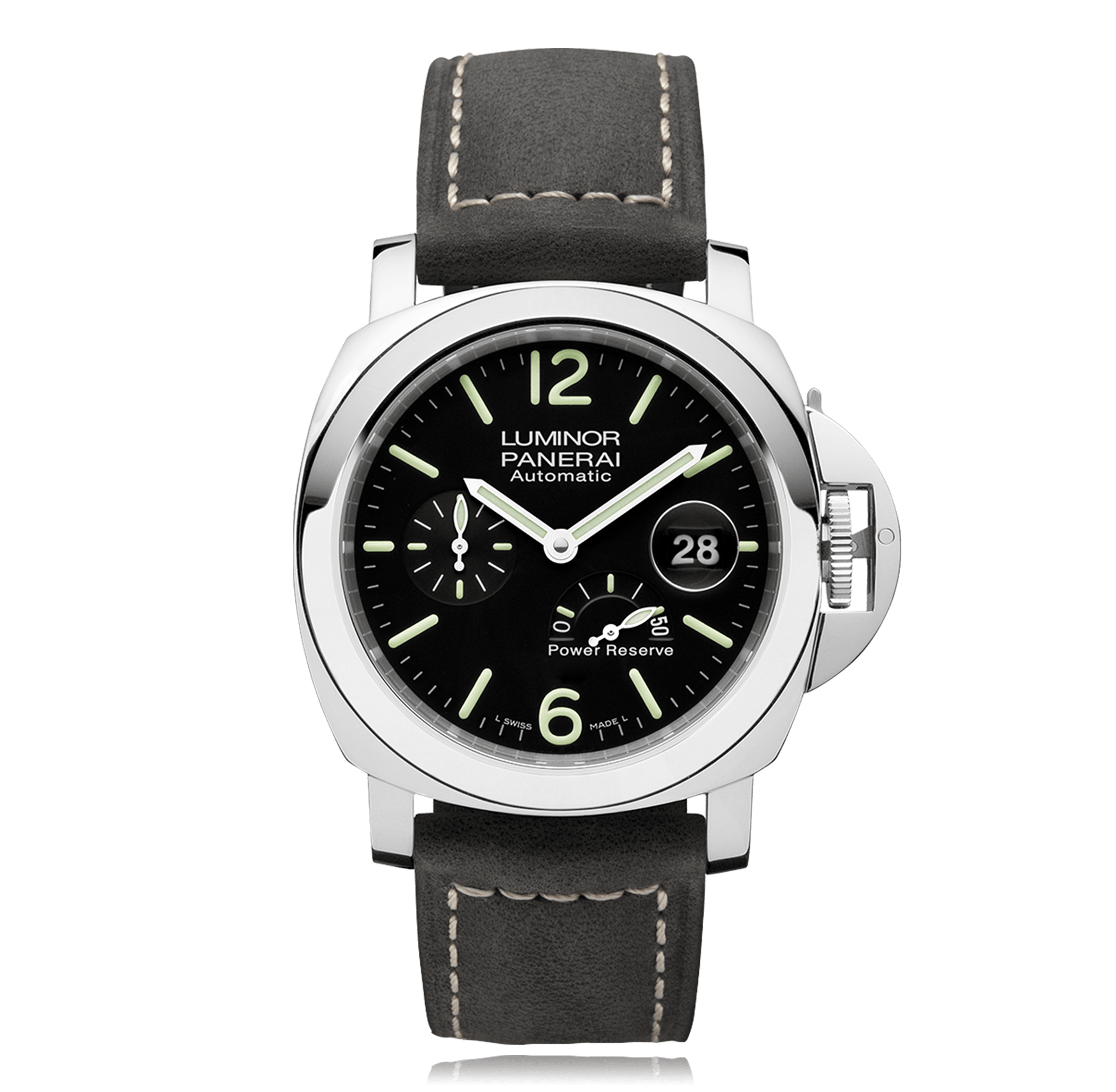 Wristwatch PANERAI Luminor steel, leather strap, with pin buckle, black dial with arab./Index, automatic sapphire-crystal, 30 atm, with Power-reserve, Ref.:PAM01090