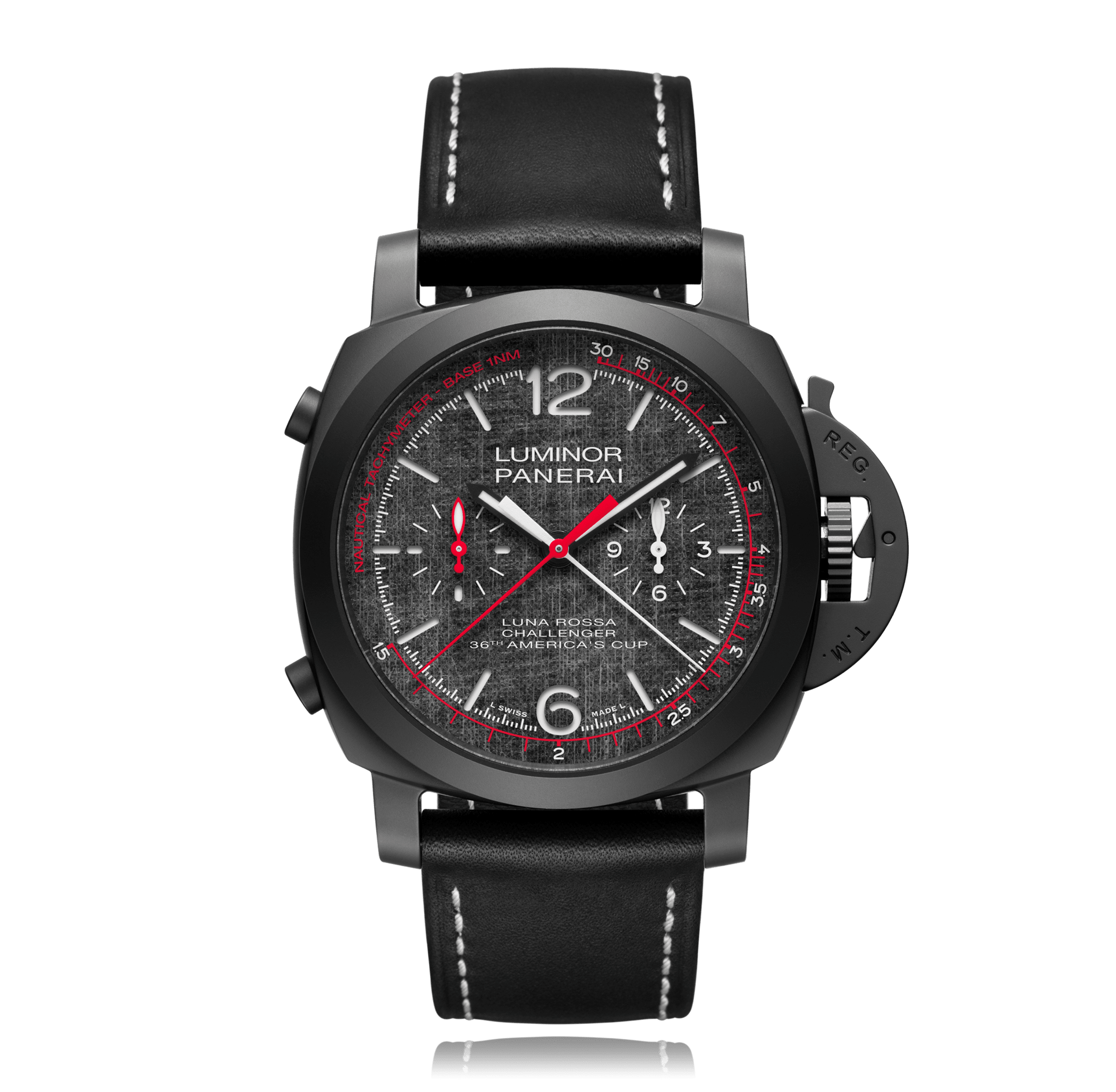 Chronograph PANERAI Luminor 44mm, ceramic, leather strap, black dial with arab./Index, automatic Cal. P.9100, sapphire-crystal, 10 atm, Ref.:PAM01037