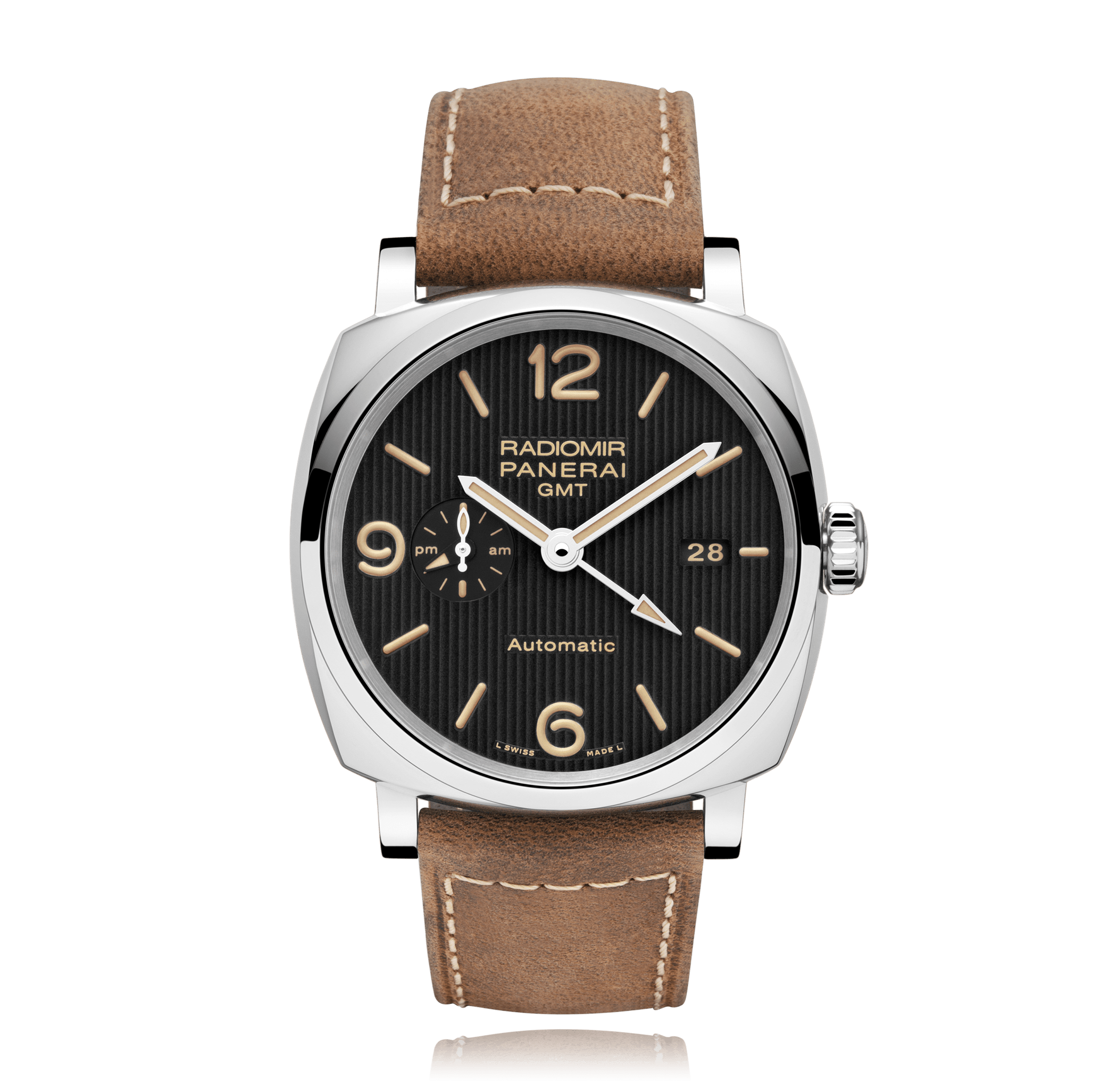 Wristwatch PANERAI Radiomir 45mm, steel, leather strap, black dial with arab./Index, automatic Cal. P.4001, sapphire-crystal, 10 atm, with Power-reserve, Ref.:PAM00657