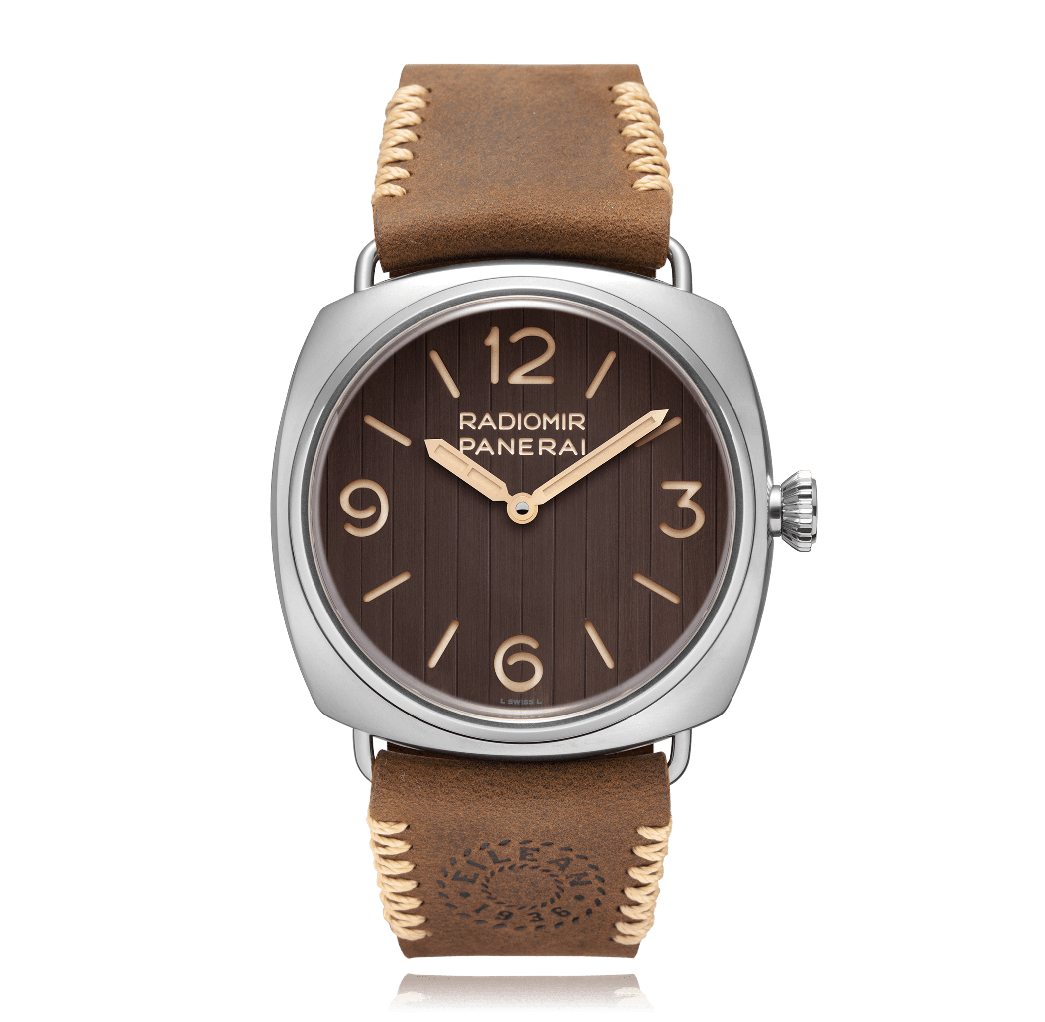 Wristwatch, PANERAI Radiomir Eilean, 45 mm, steel, bracelet calfskin, with pin buckle, brown dial with arab./Index, manual winding, Cal. P.6000, sapphire-crystal, ef.:PAM01243