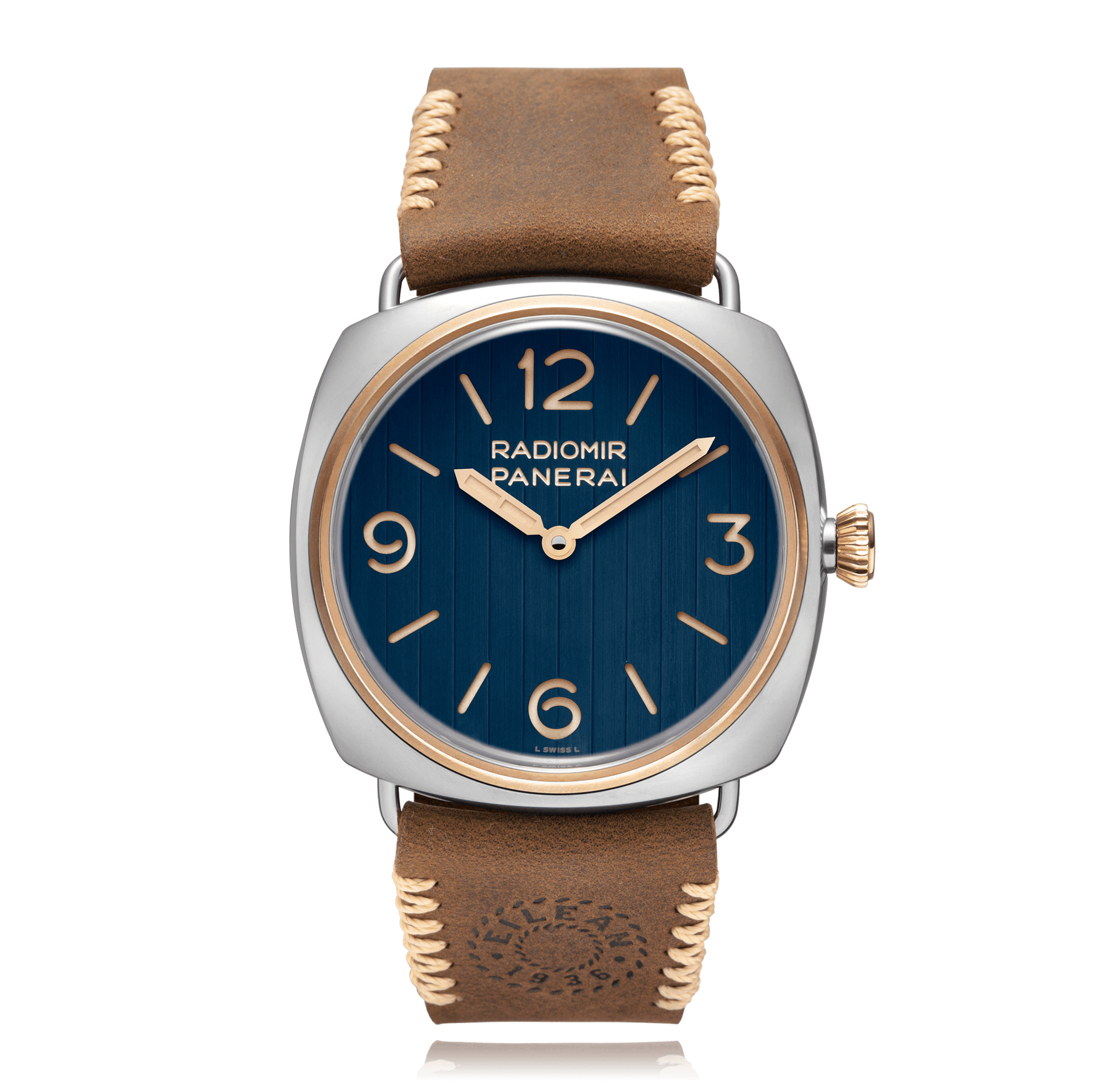 Wristwatch, PANERAI Radiomir Eilean, 45 mm, steel, bracelet calfskin, with pin buckle, blue dial with arab./Index, manual winding, Cal. P.6000, sapphire-crystal, ef.:PAM01244