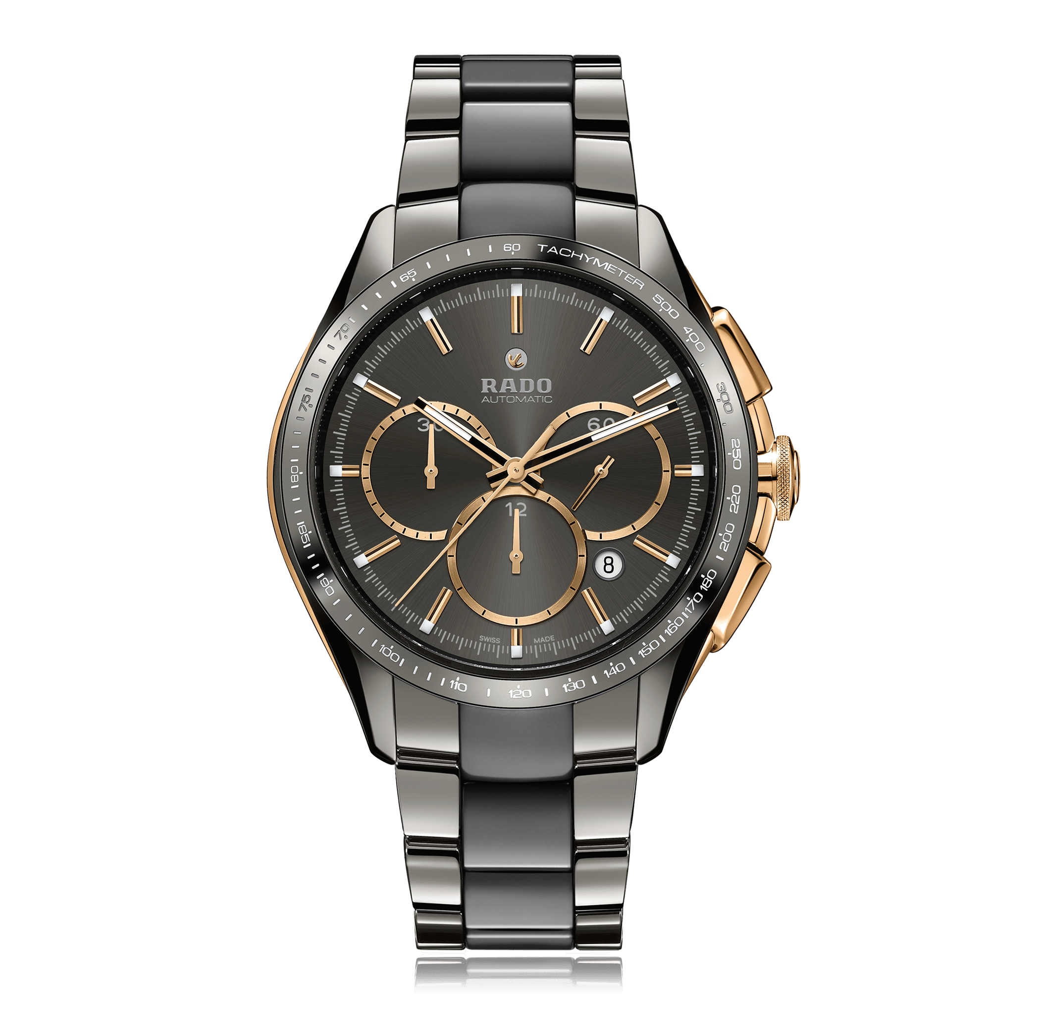 Chronograph RADO HyperChrome 45mm, ceramic/PVD, ceramic bracelet, rhodium-plated/grey dial with index, automatic Cal. ETA 2894-2, sapphire-crystal, 10 atm, Ref.:R32118102