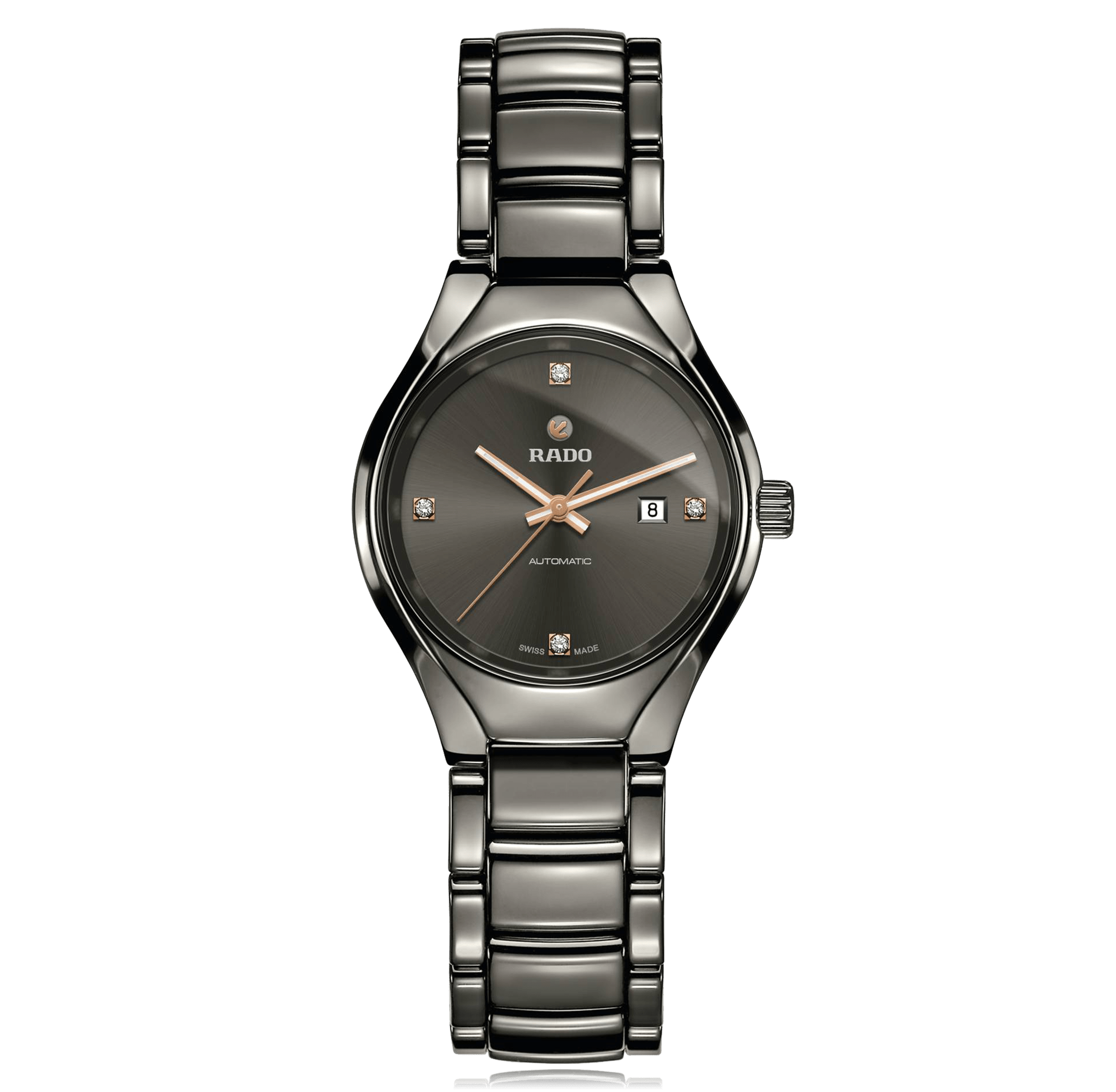 Wristwatch RADO True 30 mm, ceramic, ceramic bracelet, rhodium-plated/grey dial with 4 diamonds, automatic Cal. ETA 2671, sapphire-crystal, 5 atm, Ref.:R27243712