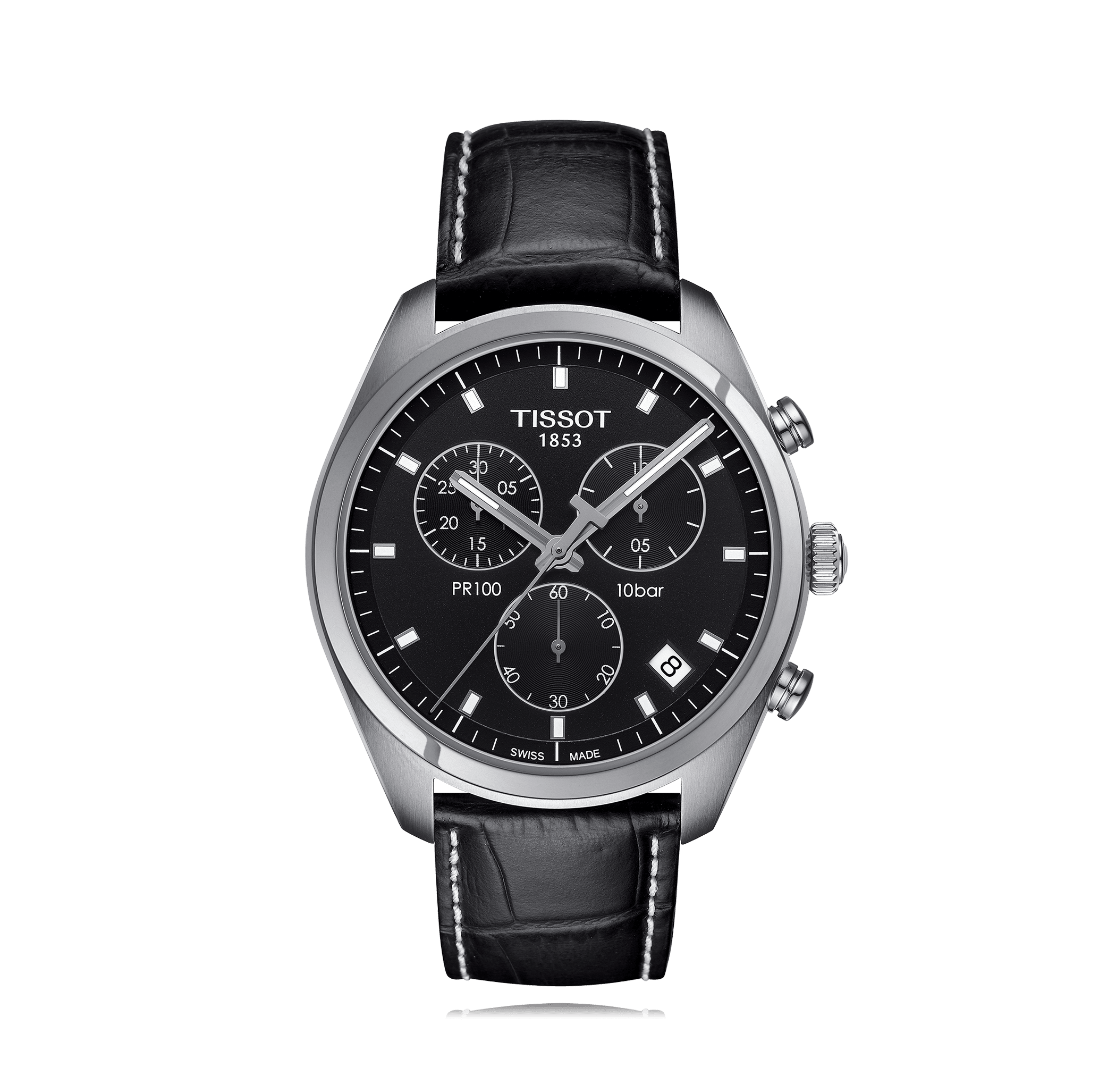 Chronograph TISSOT T-Classic PR 100, 41mm, Stahl/Leder, leather strap, with pin buckle, black dial with index, quartz Cal. ETA G10.211, sapphire-crystal, 10 atm, Ref.:T101.417.16.051.00