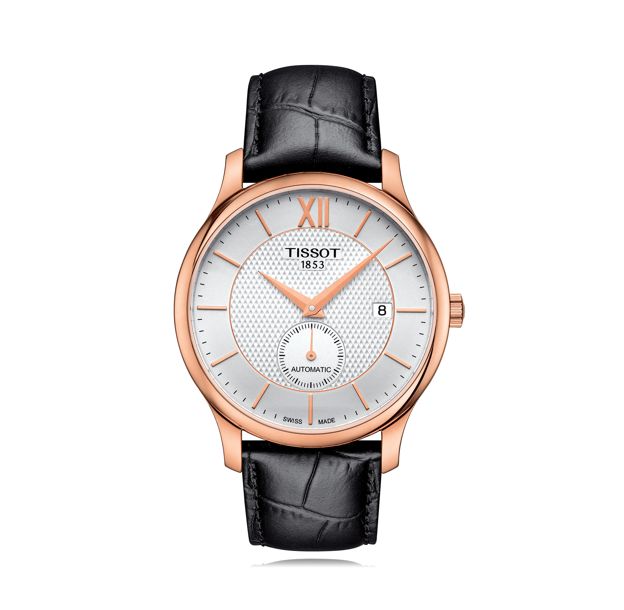 Wristwatch TISSOT T-Classic Tradition, 40mm, steel/PVD rose, leather strap, with folding clasp, silver dial with röm./Index, automatic Cal. 2825-2, sapphire-crystal, 3 atm, Ref.:T063.428.36.038.00