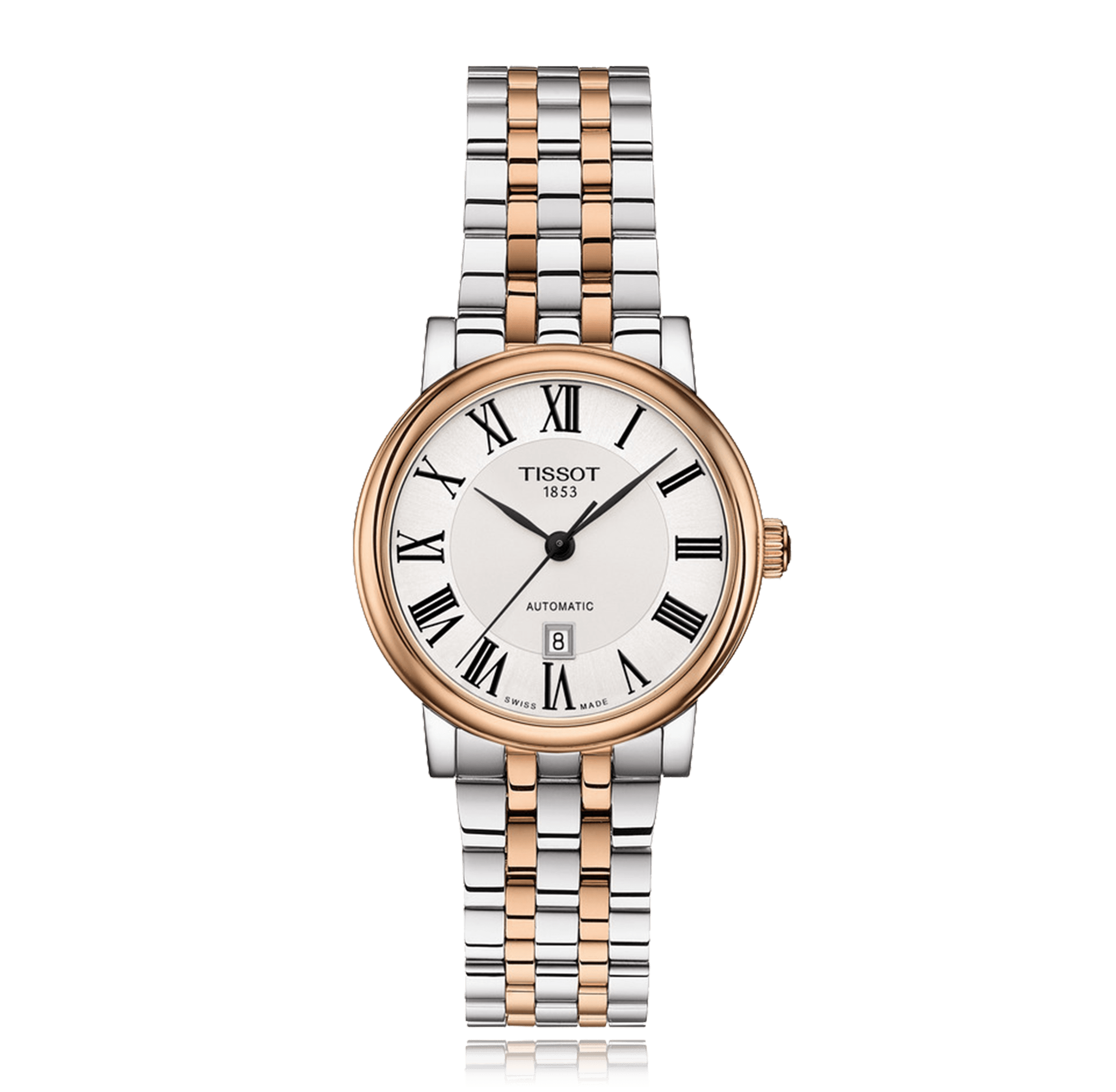Wristwatch TISSOT T-Classic Carson, 30 mm, steel/PVD, steel/PVD bracelet, with folding clasp, silver dial with romains, automatic Cal. 2671, sapphire-crystal, 5 atm, Ref.:T122.207.22.033.00